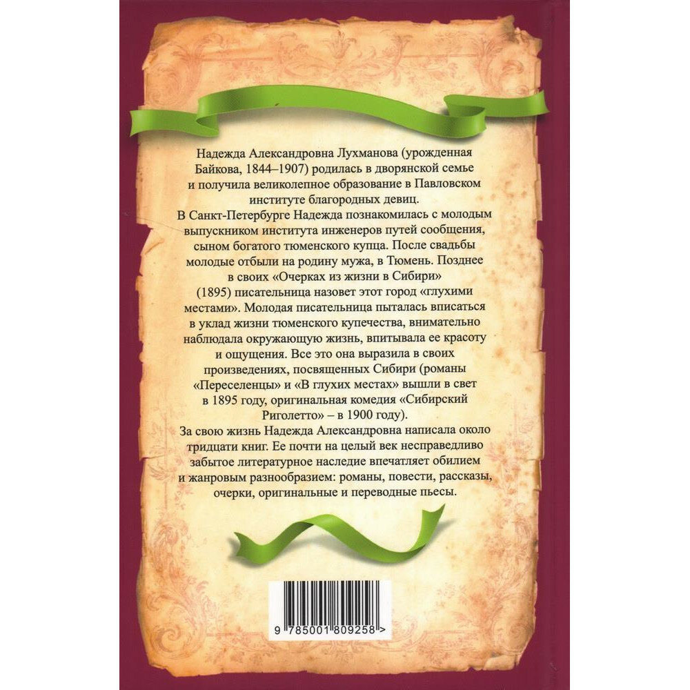 Надежда Александровна Лухманова (урожденная Байкова, 1844-1907) родилась в дворянской семье и получила великолепное образование в Павловском институте благородных девиц. В Санкт-Петербурге Надежда познакомилась с молодым выпускником института инженеров путей сообщения, сыном богатого тюменского купца. После свадьбы молодые отбыли на родину мужа, в Тюмень. Позднее в своих "Очерках из жизни в Сибири" (1895) писательница назовет этот город "глухими местами". Молодая писательница пыталась вписаться в уклад жизни тюменского купечества, внимательно наблюдала окружающую жизнь, впитывала ее красоту и ощущения. Все это она выразила в своих произведениях, посвященных Сибири (романы "Переселенцы" и "В глухих местах" вышли в свет в 1895 году, оригинальная комедия "Сибирский Риголетто" - в 1900 году).