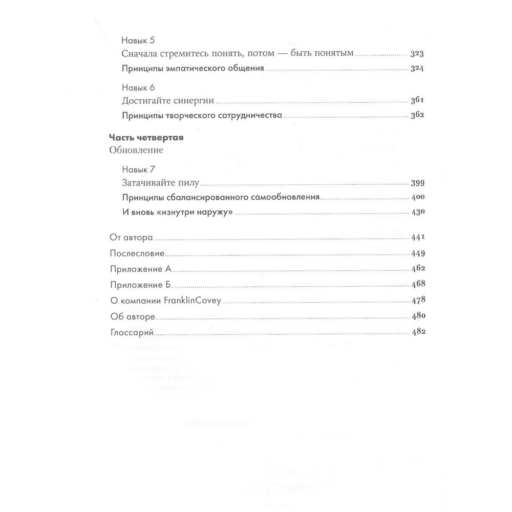 Обновленное и дополненное издание мирового супербестселлера, который по праву считается книгой № 1 о личностном росте. Она повлияла на жизни миллионов людей во всем мире, включая президентов и глав крупных корпораций, звезд спорта, политики и шоу-бизнеса, педагогов и родителей. В ней изложен системный подход к определению жизненных задач, который поможет читателю понять себя и четко сформулировать приоритеты. Авторы объясняют, как достигать самых важных целей, и показывают, что каждый человек может стать лучше вне зависимости от его социального положения, возраста и других факторов. Речь идет не об изменении имиджа, а о настоящих переменах, самосовершенствовании своей сути. В книге нет простых решений или обещания мгновенных чудес. Любые позитивные изменения требуют времени, работы и упорства. Но для людей, стремящихся максимально реализовать потенциал, заложенный в них природой, эта книга — практичная и полезная дорожная карта.