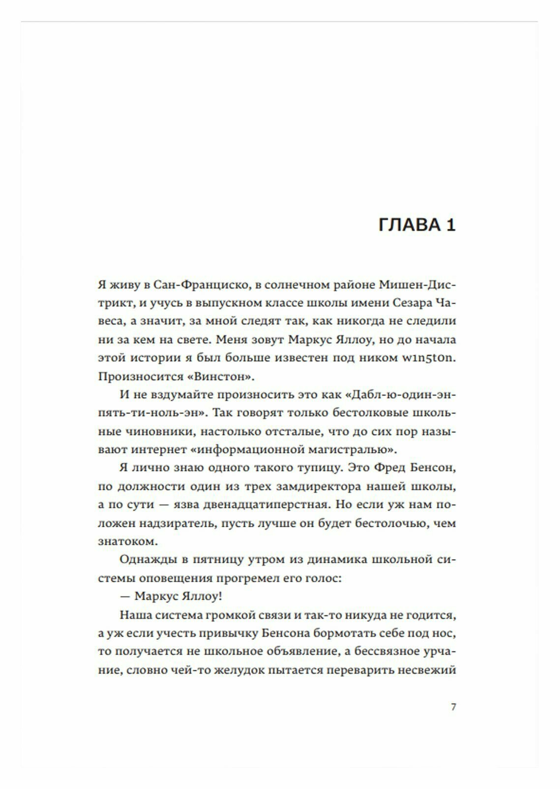 Интересный , необычный роман - антиутопия о борьбе подростков старшего школьного возраста с полицейским государством на фоне превращения американской демократии в полноценную цифровую диктатуру со всеми её атрибутами в виде утраты личной свободы и тотального контроля. С одной стороны , это фантастический триллер , с другой настоящее философское эссе , поднимающее ряд важных общественных проблем , в том числе чем предстоит пожертвовать для победы над терроризмом. Книга достаточно познавательна с технической стороны.