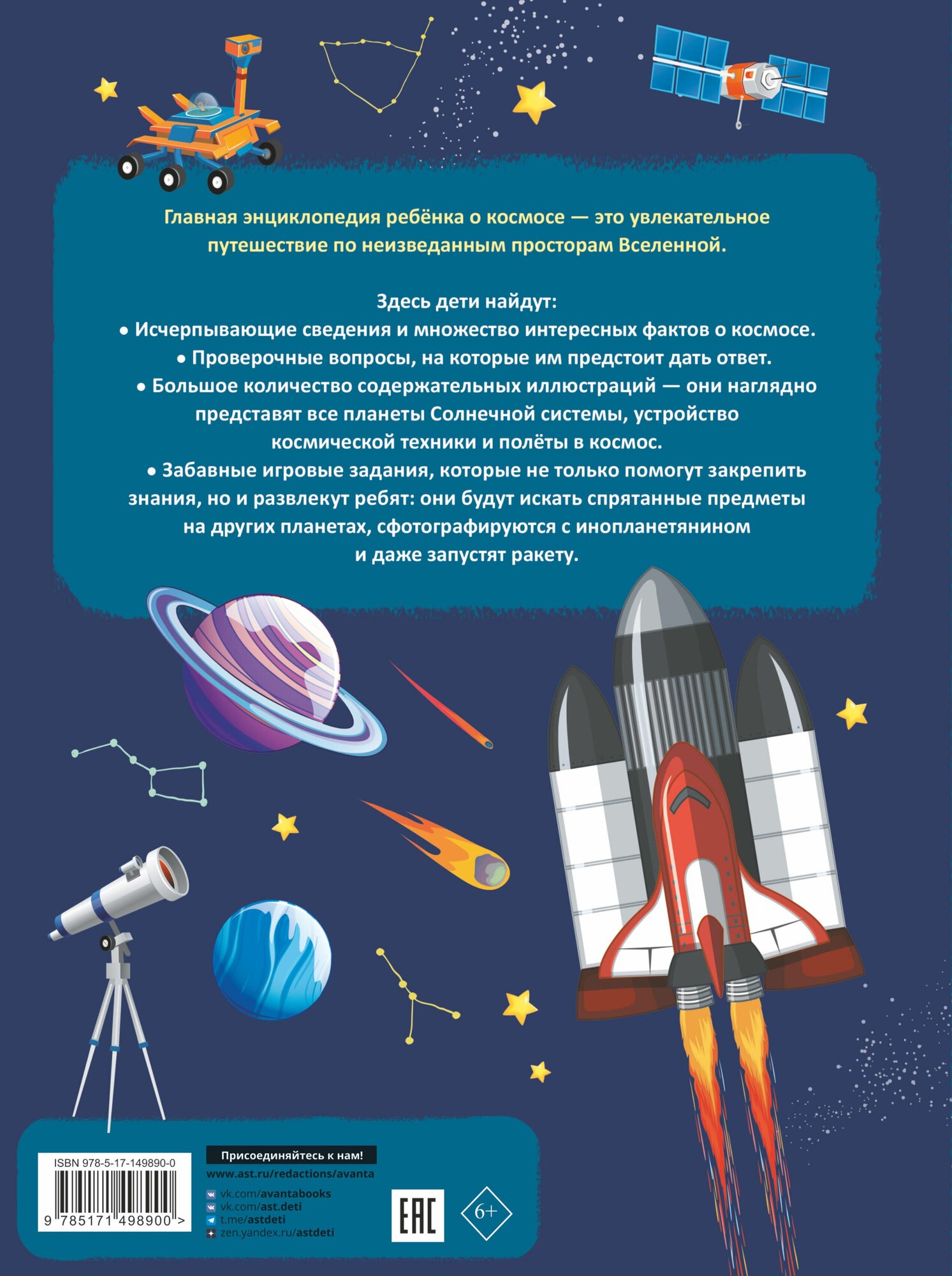 Почему нельзя увидеть чёрную дыру? Опасны ли астероиды для нашей планеты? Какой космонавт впервые покорил космос? Как устроена космическая ракета? Что собой представляют луноходы и марсоходы? Как называется новейший российский космодром и где он расположен? Кого берут в космонавты? На страницах этой познавательной энциклопедии дети найдут ответы на все свои вопросы, а множество зрелищных иллюстраций помогут им раскрыть все секреты загадочного космоса. Кроме того, здесь есть забавные игровые задания, которые не только помогут закрепить знания, но и развлекут ребят: они будут искать спрятанные предметы на других планетах, сфотографируются с инопланетянином и даже запустят ракету. Материал в издании хоть и систематизирован, но подан так, чтобы информация была понятна и, что немаловажно, интересна юному читателю.
