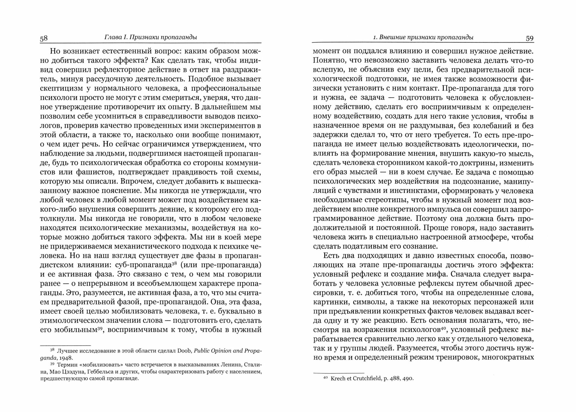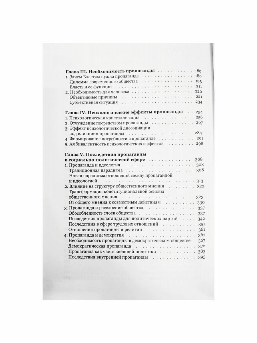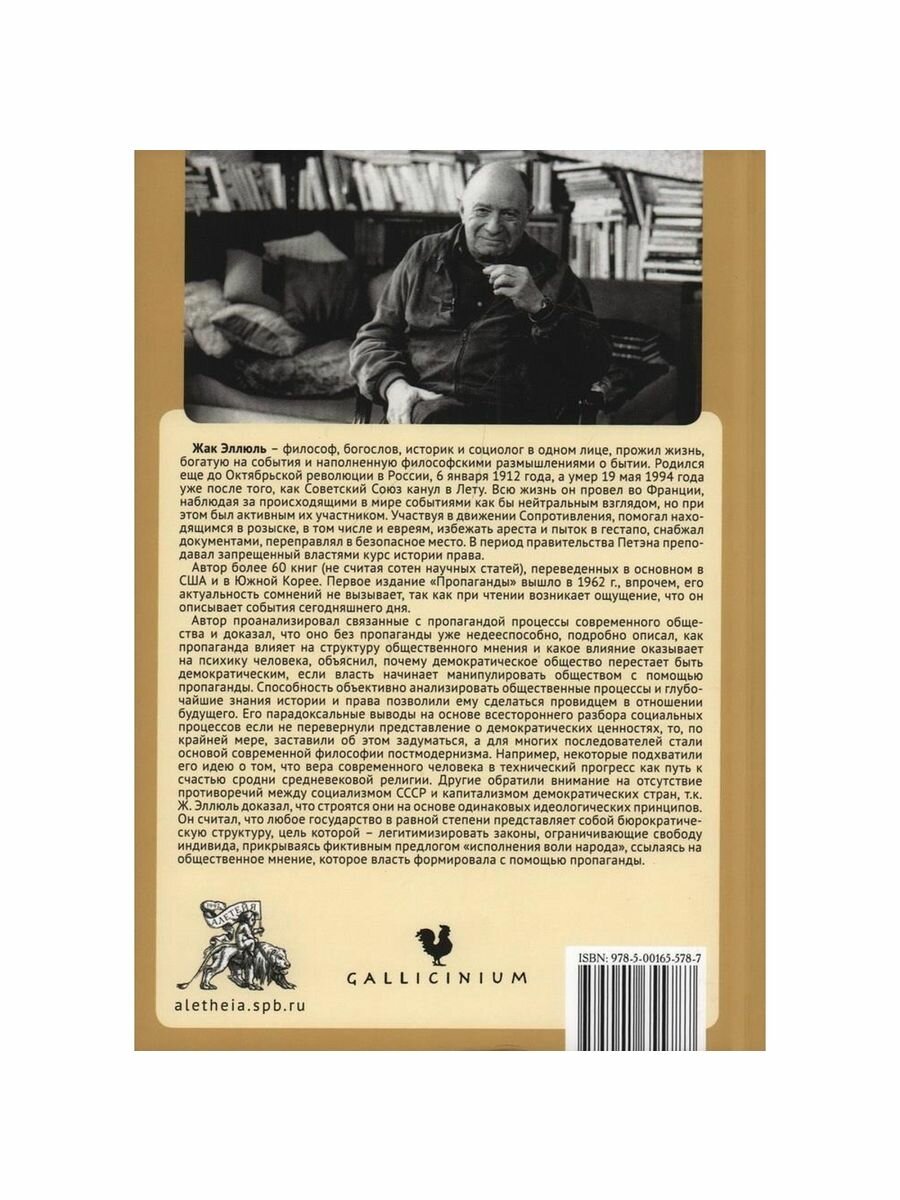 Книга Жака Сезара Эмиля Эллюля, философа, богослова, историка и социолога в одном лице, посвящена пропаганде. Он проанализировал связанные с пропагандой процессы современного общества и доказал, что оно без пропаганды уже недееспособно, подробно описал, как пропаганда влияет на структуру общественного мнения и какое влияние оказывает на психику человека, объяснил, почему демократическое общество перестает быть демократическим, если власть начинает манипулировать обществом с помощью пропаганды. Исследование Жака Эллюля будет интересно историкам и социологам, так как посвящено анализу явления, в котором все мы невольно принимаем участие, политтехнологи и пропагандисты должны взять его на вооружение в качестве учебника для того, чтобы научиться обманывать человека так, чтобы он об этом и не догадался, а простому человеку надо ее прочитать, чтобы попытаться не быть обманутым. Дата первого издания «Пропаганды» – 1962 г., впрочем, актуальность сомнений не вызывает, так как при ее прочтении возникает ощущение, что автор описывает события наших дней.