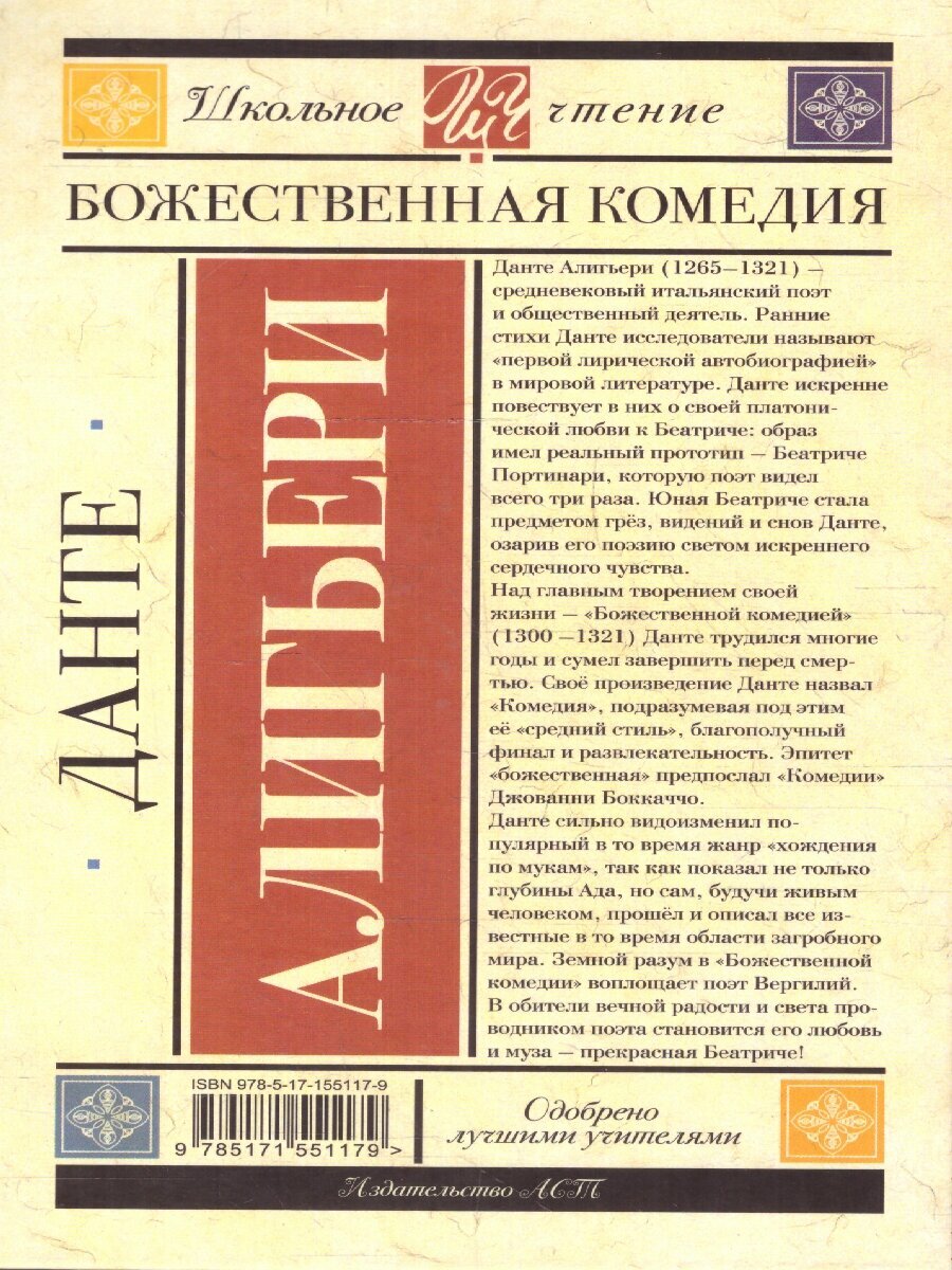 Восторг! Купила сестре по школьной программе, в итоге взяла две книжки, решила перечитать великую поэму вне времени. Думаю, сюжет не нуждается в моих описаниях)) если увлекаетесь средневековьем или хотите познакомиться с этим периодом в интереснейшей форме – это точно та книга. Всегда тщательно выбираю издания, считаю, если уж покупать печатную версию, то добротную, качественную, чтобы можно было брать с собой и книжка не пострадала, да и в целом намного приятнее читать книги с высоким качеством страниц и с хорошим шрифтом. АСТ в этом плане никогда не подводил, рекомендую!