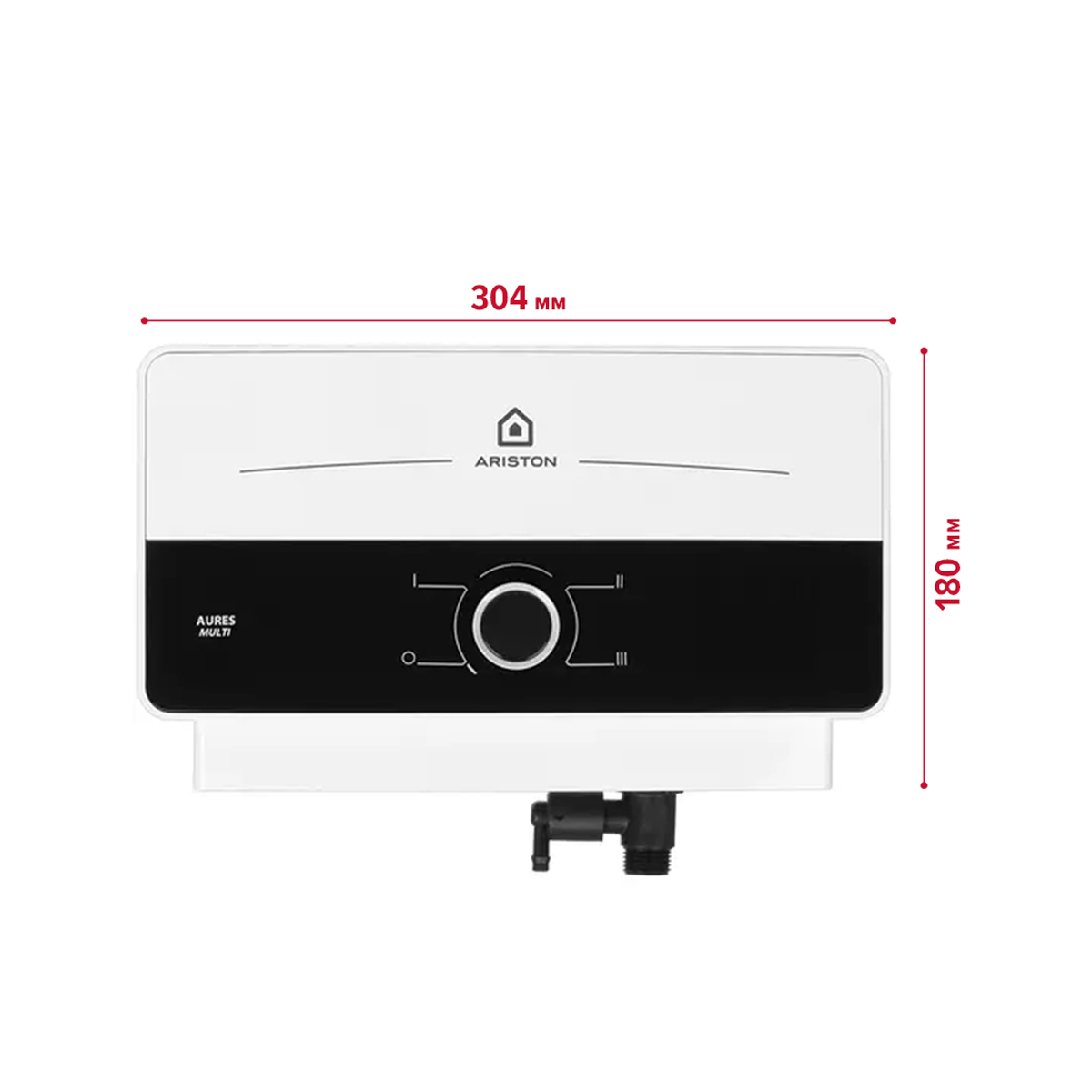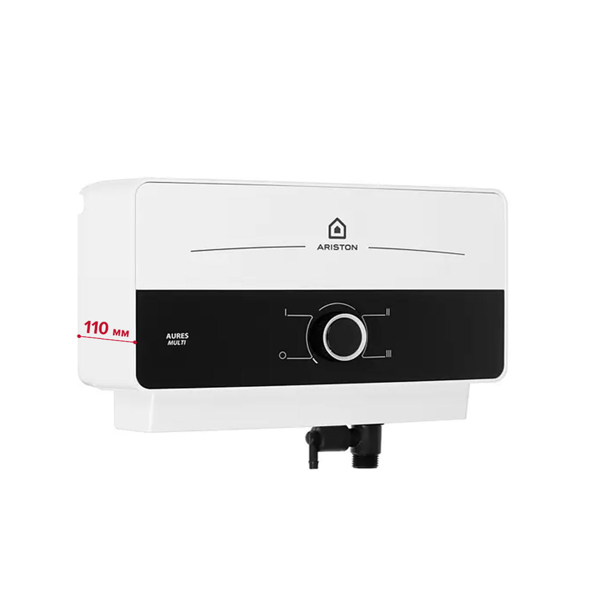 Проточный электрический водонагреватель Ariston AURES M 7. 7 работает в 3 режимах энергетического потребления, в зависимости от положения механической ручки управления, задействуется 3,3, 4,4 либо 7,7 кВ. При выборе максимальной мощности трубчатого нагревательного компонента и температуре воды на уровне +25 градусов Цельсия производительность достигает 4,3-4,5 литров за минуту. Данного показателя достаточно для одновременного обслуживания нескольких точек водозабора, например, душевой кабины и мойки на кухне. Благодаря компактным размерам, водонагреватель Ariston AURES M 7. 7 устанавливается в горизонтальном положении на стене. Корпус выполнен из белого пластика, что облегчает конструкцию. Данная модель предполагает нижнюю подводку труб холодного и горячего водоснабжения.