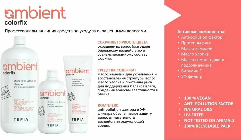 Отсутствие в составе сульфатных ПАВ обеспечивает мягкое воздействие, оптимальный для волос pH 4,5 закрывает пигмент в кутикуле, способствуя сохранению яркости и насыщенности цвета окрашенных волос.