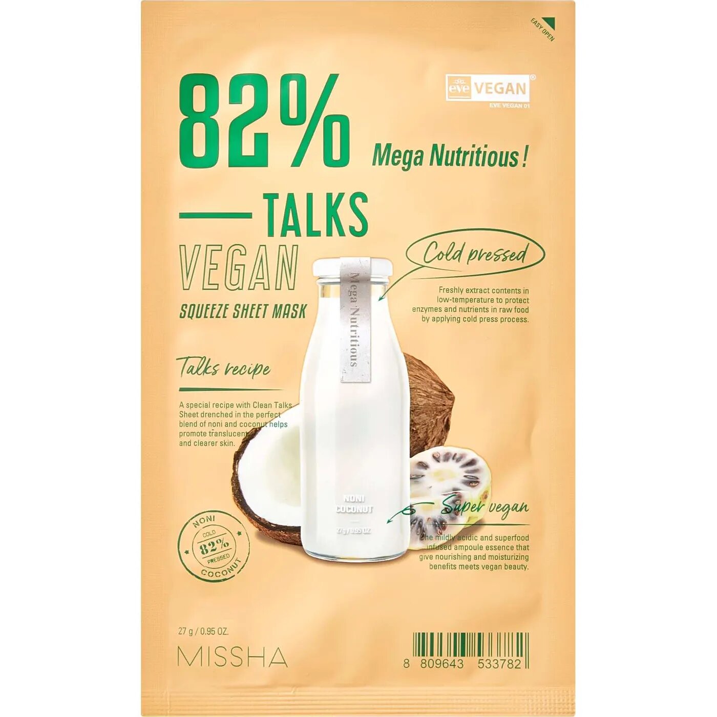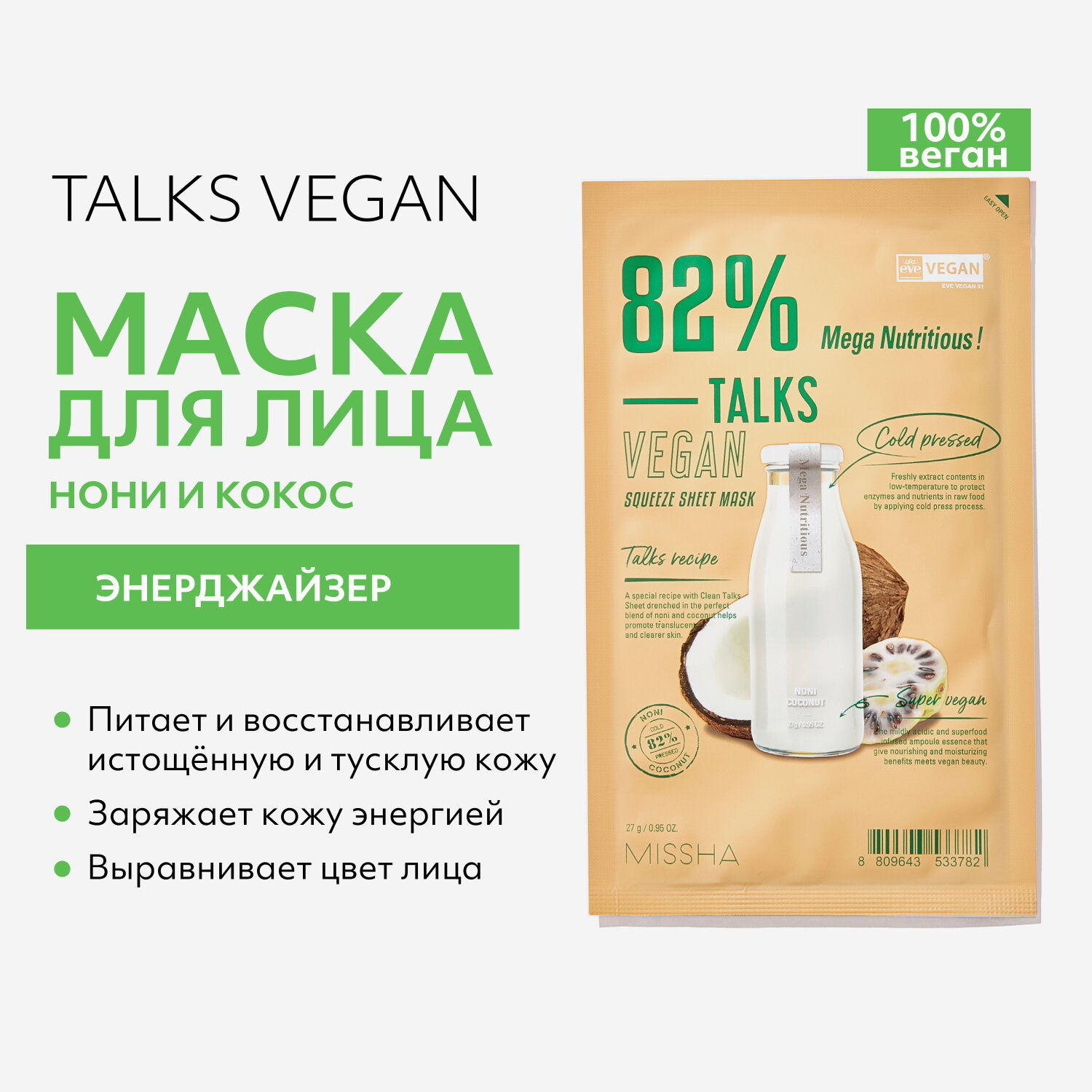 Тканевая маска-энерджайзер с экстрактами нони и кокоса Mega Nutritious 27 г Missha (ЭХ99989440240)