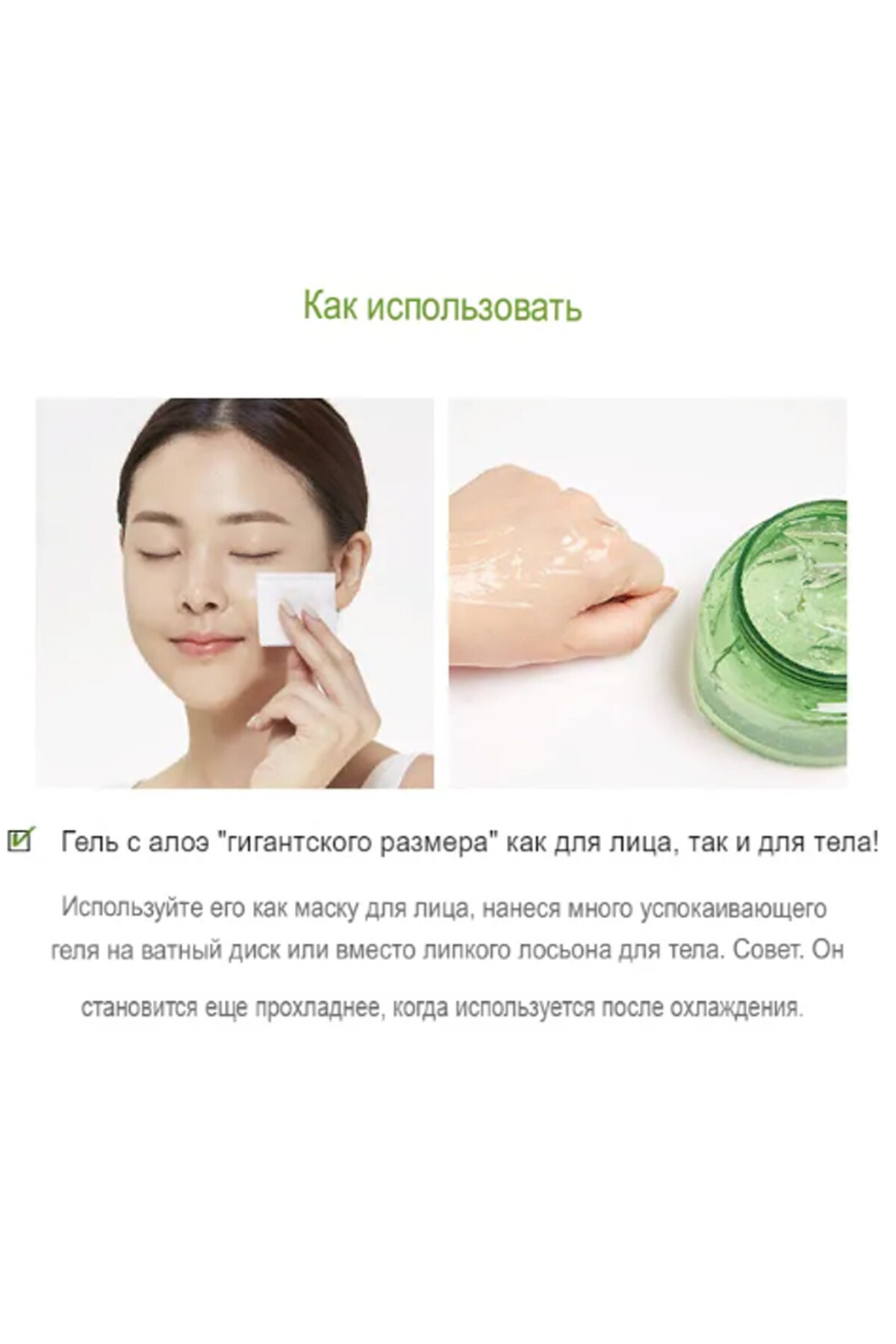 Успокаивающий гель Missha Premium CICA Aloe подходит для всех типов кожи, включая сухую и чувствительную. Рекомендован как для женщин, так и для мужчин. Для более выраженного охлаждающего эффекта гель допускается хранить в холодильнике. Средство экономно расходуется и быстро впитывается, не оставляет после себя липкой плёнки или жирного блеска на коже. Для эффекта сияющей кожи рекомендуем смешивать Missha Premium CICA Aloe с Вашей привычной основой под макияж или тональным средством.
