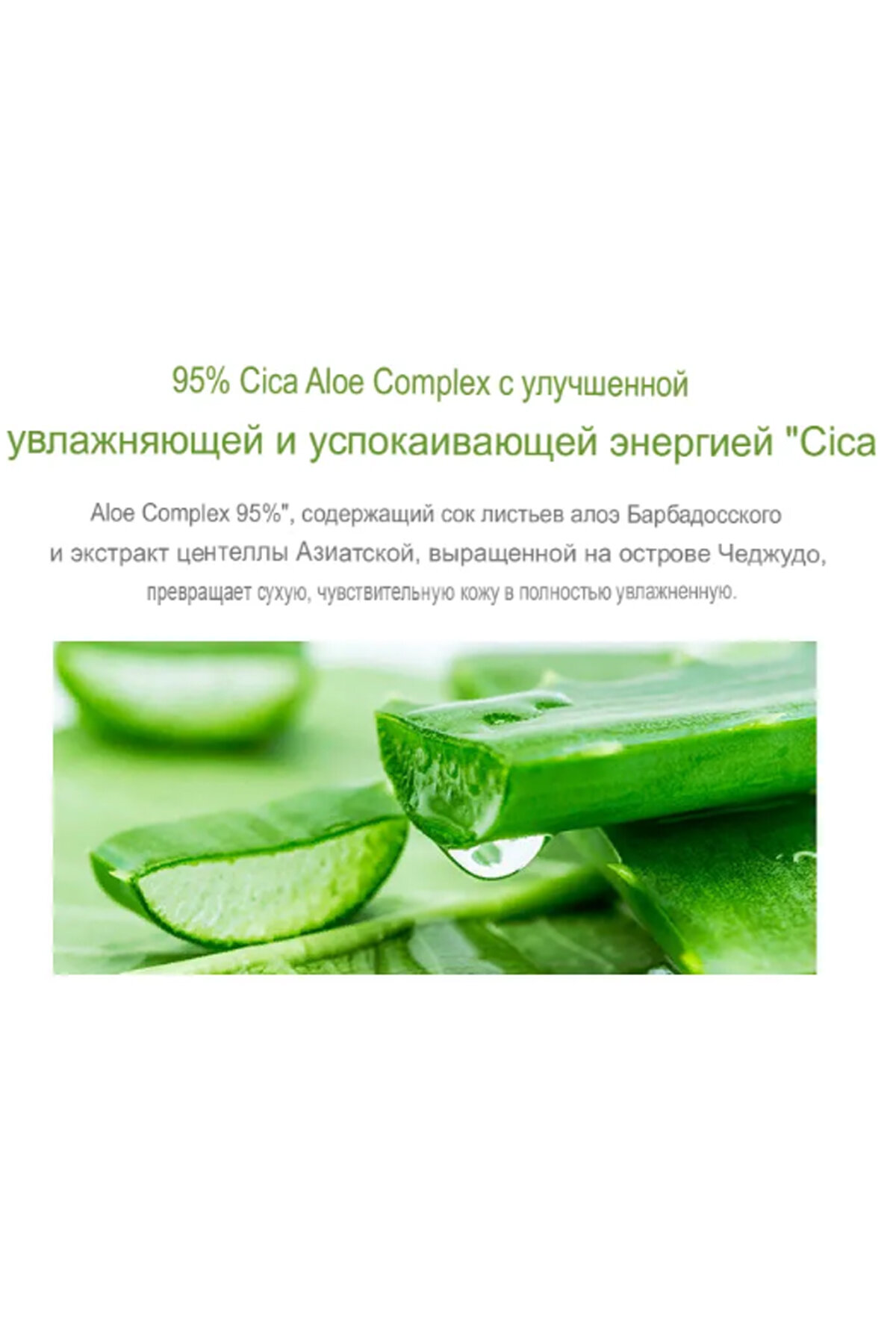 Гель Missha Premium CICA Aloe содержит 95% органического сока алое барбаденис, который прекрасно увлажняет кожу и поддерживает оптимальный уровень влаги в течение длительного времени. Заживляет, успокаивает и защищает кожу от неблагоприятных факторов окружающей среды. Благодаря своему базовому компоненту гель приятно охлаждает и освежает кожу, оказывает тонизирующий эффект, устраняет сухость и стянутость кожи после умывания. Экстракт центеллы азиатской эффективно дополняет увлажняющее и противовоспалительное действие алое, способствует восстановлению барьерных свойств кожи, снижает чувствительность, уменьшает отеки и проявление купероза. Гиалуроновая кислота интенсивно напитывает влагой глубокие слои кожи и способствует сокращению мимических морщин. Коллаген повышает упругость и эластичность кожи. Комплекс натуральных экстрактов – родиолы розовой, вербены, эдельвейса, исландского мха, листьев гуавы и нескольких видов морских водорослей – оказывает мощное антиоксидантное, омолаживающее и регенерирующее действие, насыщает кожу витаминами и стимулирует обменные процессы в клетках кожи.