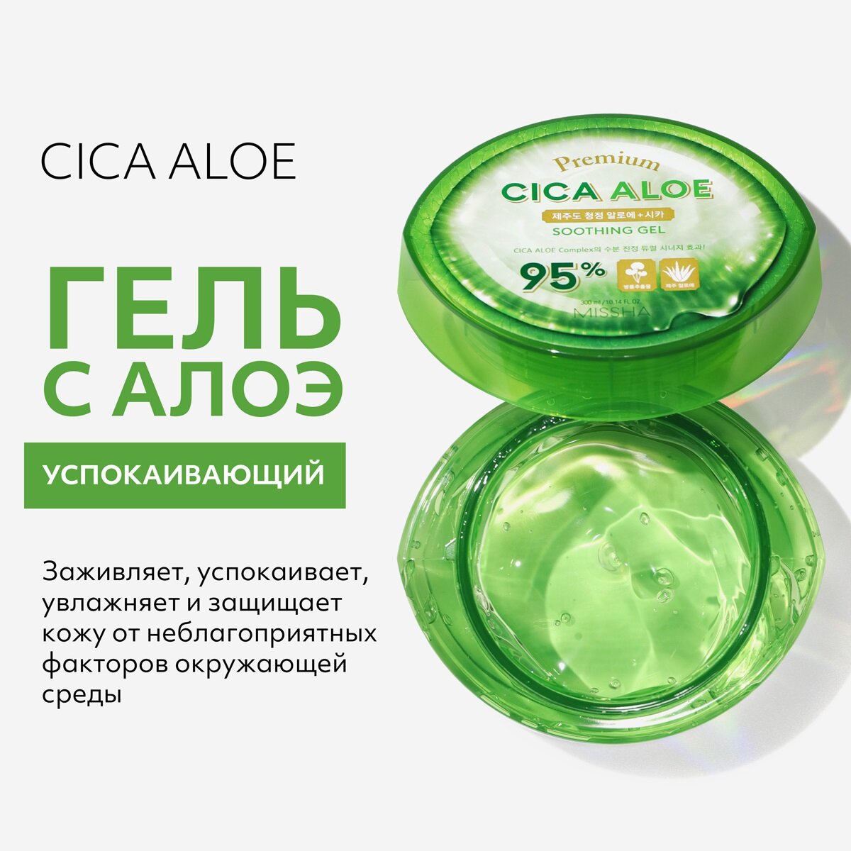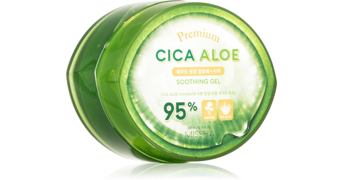 Успокаивающий гель Missha Premium CICA Aloe – это универсальное увлажняющее, заживляющее, омолаживающее и антиоксидантное средство для кожи лица и тела. Одно многофункциональное уходовое средство на Вашей полке в большой банке на 300 мл – это:
