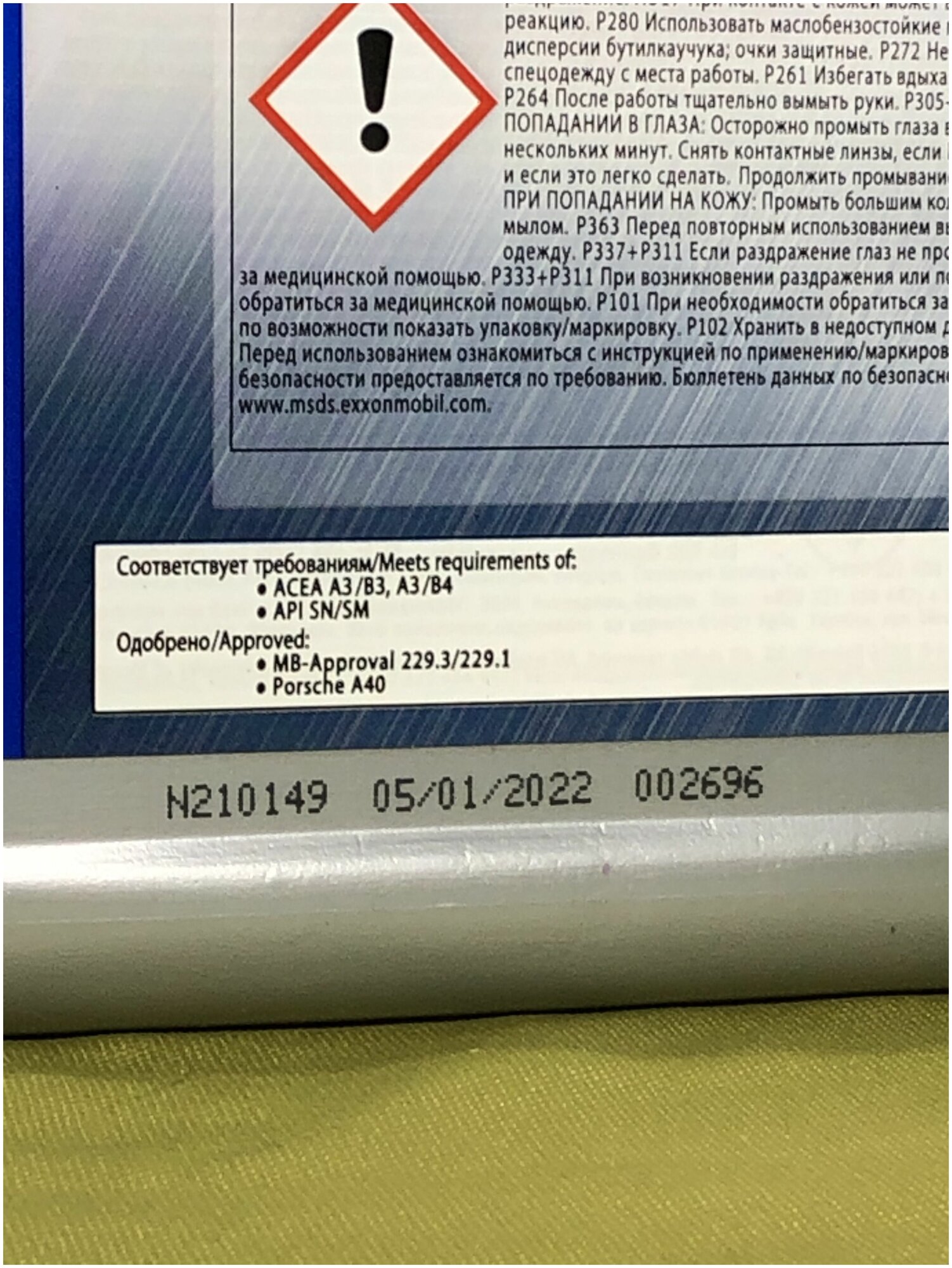 | Допуски OEM | MB-Approval229.1, MB-Approval229.3, Porsche A40, FIAT 9.55535-M2, Lexus LFA Service Fill |
