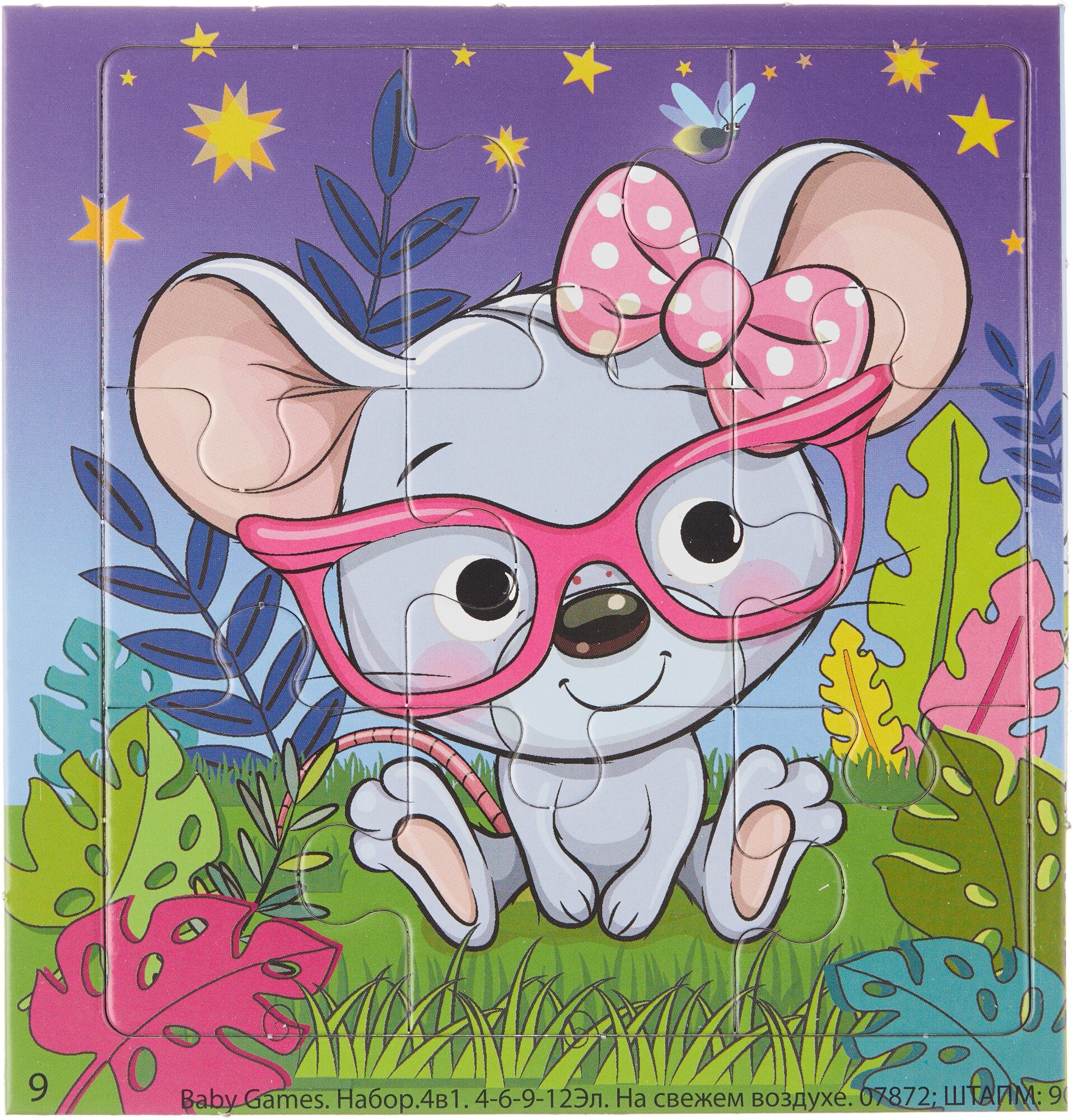 Набор пазлов 4в1 "На свежем воздухе" - это комплект пазлов с разной элементностью, включающий в себя головоломки из 4, 6, 9, 12 элементов, объединенных общей тематикой. Это необычная коллекция картинок с изображением милых персонажей, которая понравится любому ребенку. Соберите всю коллекцию! Постепенно усложняя сборку пазла от 4 элементов до 12 элементов, ребенок научится внимательности, концентрации, а также сможет развить мелкую моторику.