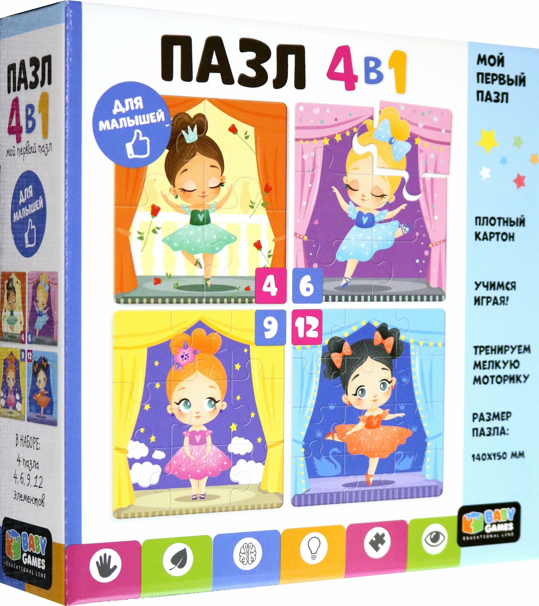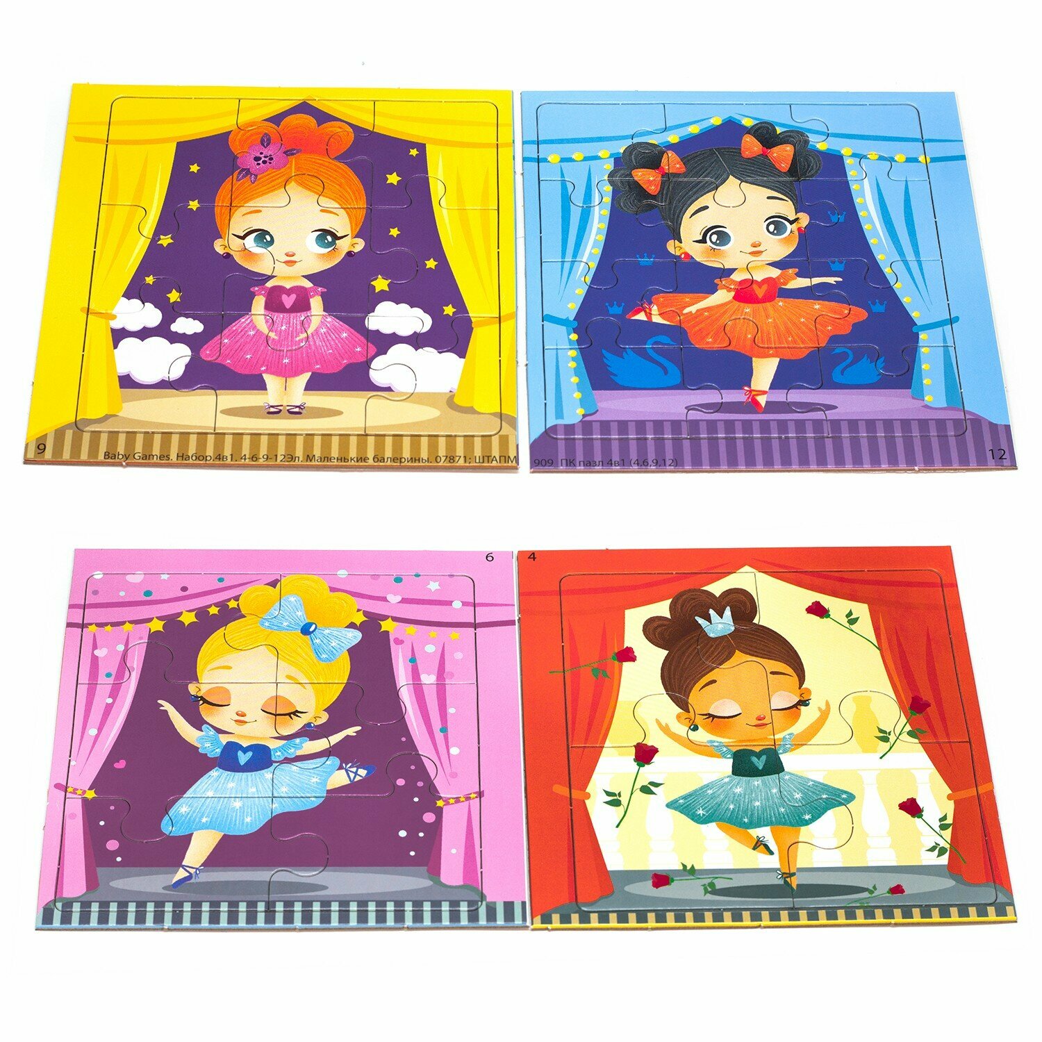 Набор пазлов 4в1 "Маленькие балерины" - это комплект пазлов с разной элементностью, включающий в себя головоломки из 4, 6, 9, 12 элементов, объединенных общей тематикой. Это необычная коллекция картинок с изображением милых персонажей, которая понравится любому ребенку. Соберите всю коллекцию! Постепенно усложняя сборку пазла от 4 элементов до 12 элементов, ребенок научится внимательности, концентрации, а также сможет развить мелкую моторику.