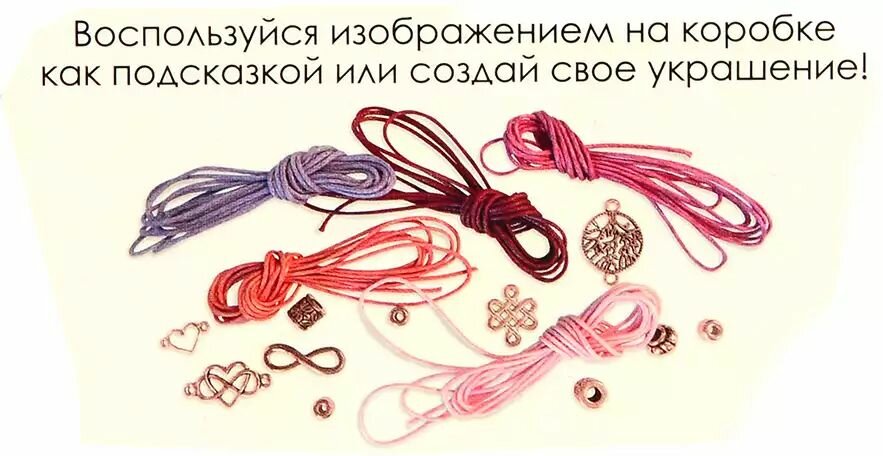 В наборе: шелковые шнуры, шармики, бумины из металла, инструкция.