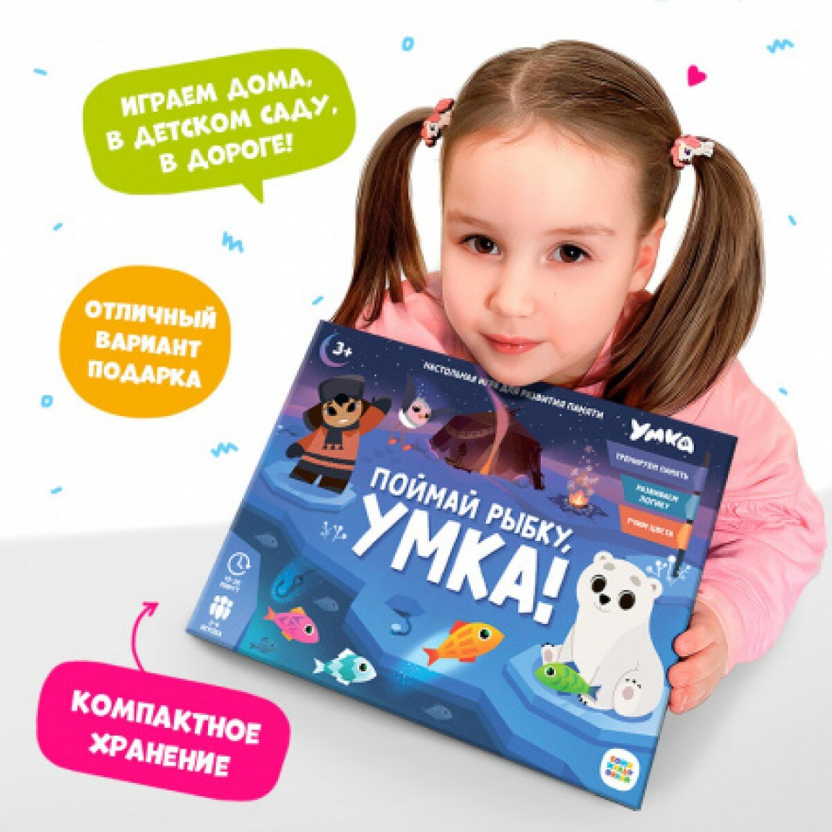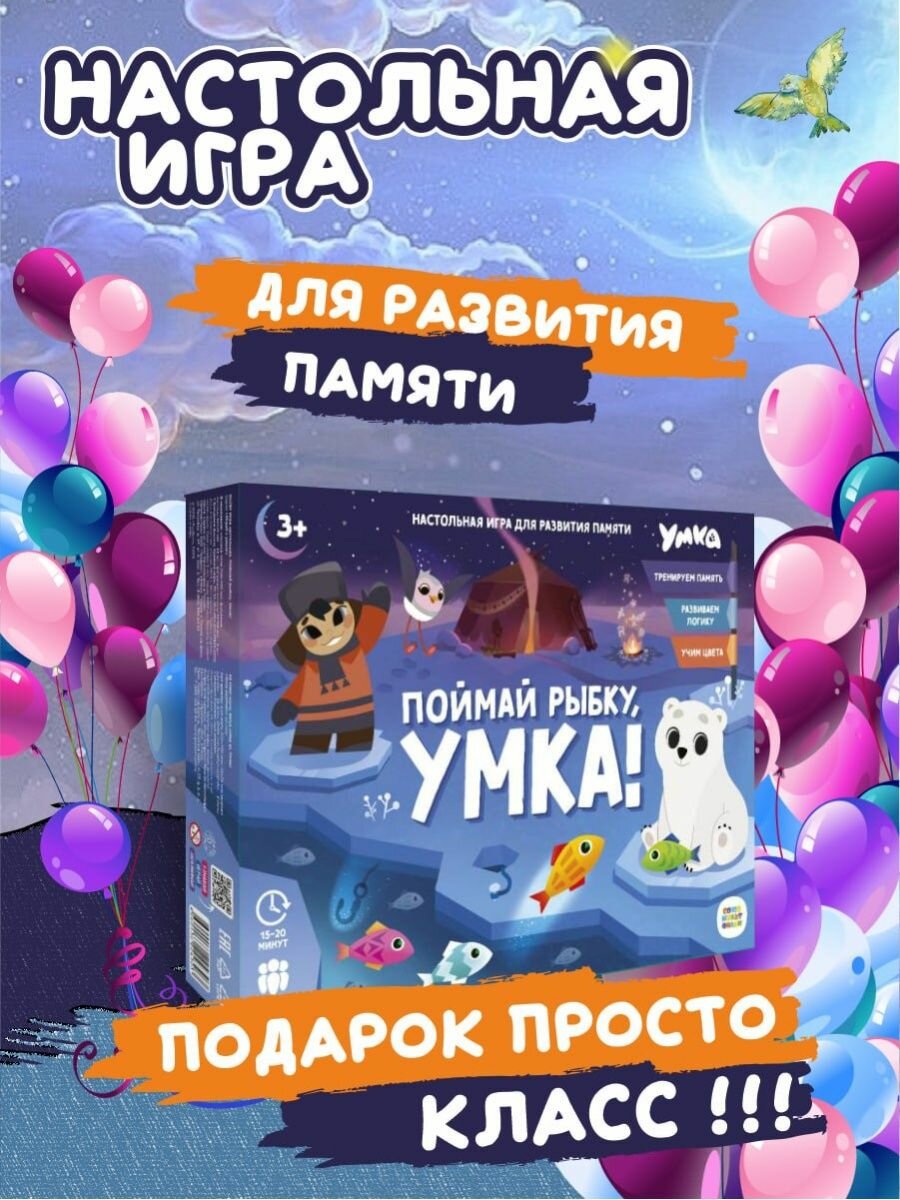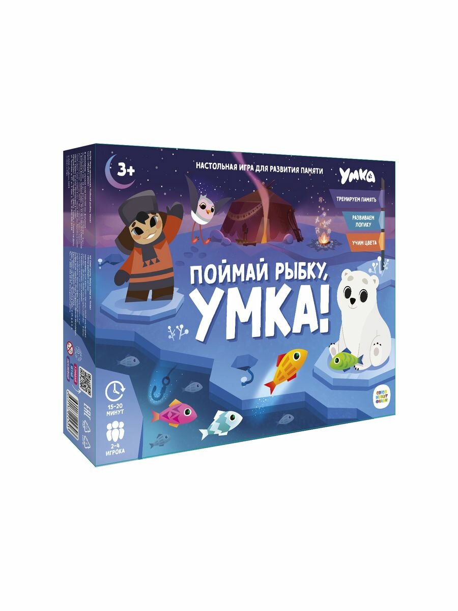 "Поймай рыбку, Умка" - это настольная игра для развития памяти со знакомой механикой мемори и любимыми персонажами! Сможешь отыскать всех рыбок, которые спрятались подо льдом? Скорее отправляйся на рыбалку вместе с Умкой и его друзьями! Играйте всей семьёй и тренируйте память, внимание и мелкую моторику малыша. Прыгайте по льдинкам, ловите рыбок, запоминайте цвета и веселитесь вместе с героями любимого мультфильма!