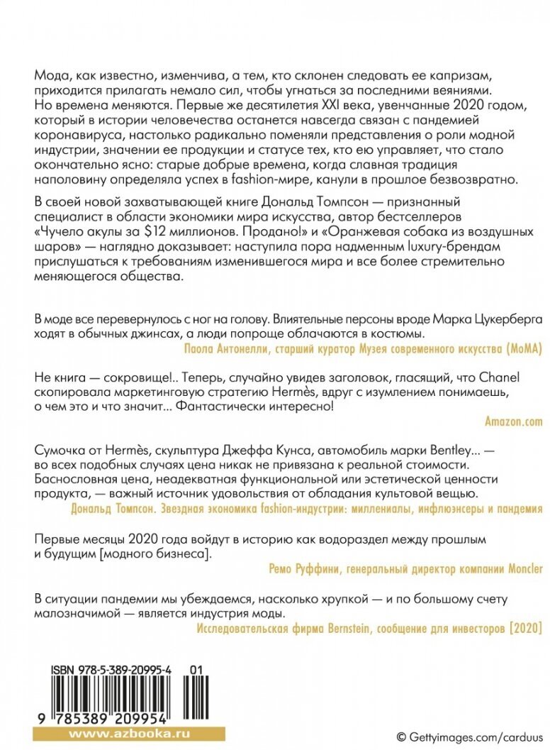 Мода, как известно, изменчива, а тем, кто склонен следовать ее капризам, приходится прилагать немало сил, чтобы угнаться за последними веяниями. Но времена меняются. Первые же десятилетия XXI века, увенчанные 2020 годом, который в истории человечества останется навсегда связан с пандемией коронавируса, настолько радикально поменяли представления о роли модной индустрии, значении ее продукции и статусе тех, кто ею управляет, что стало окончательно ясно: старые добрые времена, когда славная традиция наполовину определяла успех в fashion-мире, канули в прошлое безвозвратно. В своей новой захватывающей книге Дональд Томпсон - признанный специалист в области экономики мира искусства, автор бестселлеров "Чучело акулы за $12 миллионов. Продано!" и "Оранжевая собака из воздушных шаров" - наглядно доказывает: наступила пора надменным luxury-брендам прислушаться к требованиям изменившегося мира и все более стремительно меняющегося общества.