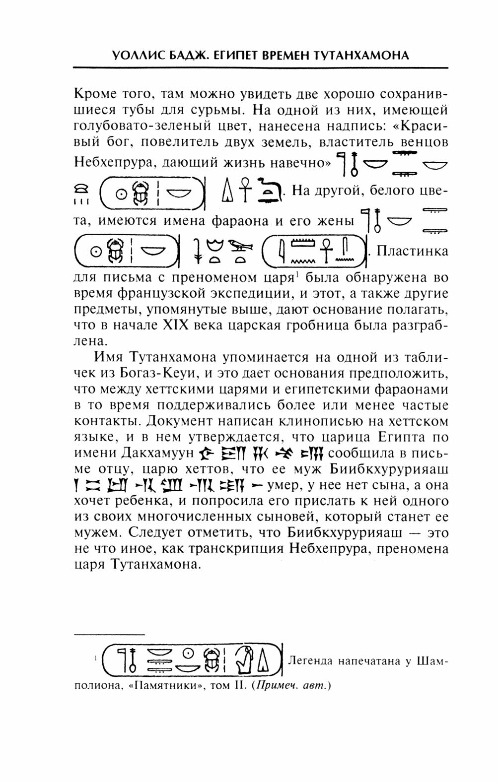 Эта небольшая книга была написана в 1923 году крупнейшим британским египтологом Уоллисом Баджем (1857-1934) буквально по горячим следам открытия гробницы Тутанхамона по просьбе самого лорда Карнарвона, желавшего положить конец всевозможным спекуляциям, получившим распространение после его открытия. Оригинальное название книги переводится как «Тутанхамон. Амонизм, атонизм и египетский монотеизм», что бесспорно ближе к истине, да и то не совсем отражает содержание книги. Собственно о Тутанхамоне в ней совсем немного. Оно и понятно – все, что мы в действительности знаем об этом фараоне, можно уместить на носовом платке. Куда больше место отведено в книге рассмотрению культа Амона и сопутствующих богов и сменившего его культа Атона – т. е. культовой жизни Египта от Аменхотепа III до Тутанхамона, «религиозной революции» Аменхотепа IV и ее анализу.