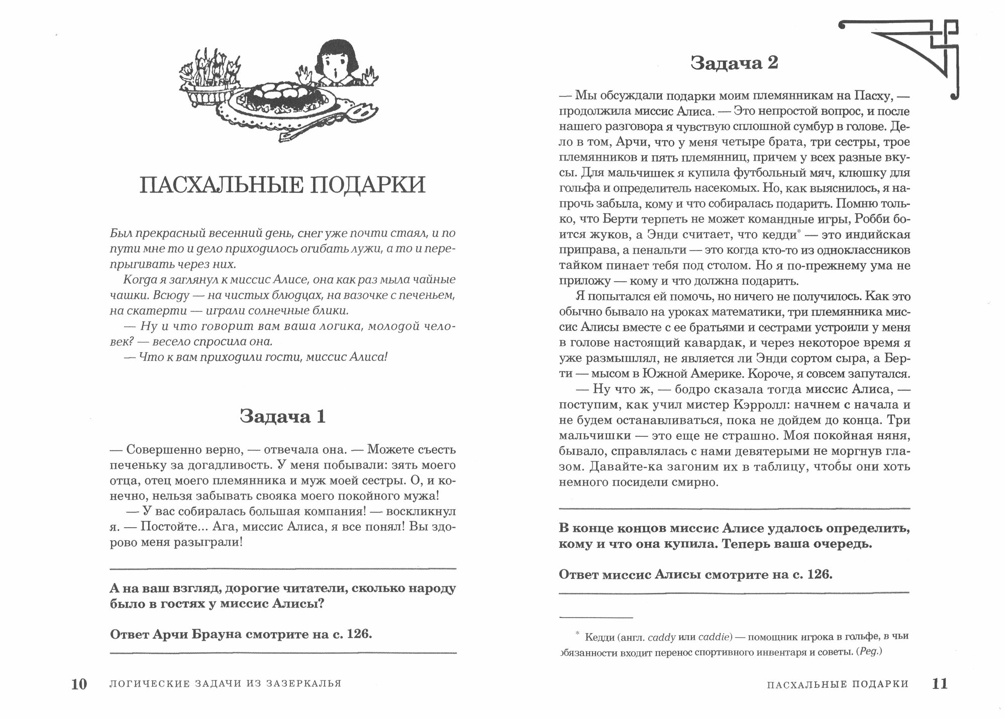 Это задачи для тех, кого математика пугает, а размять ум иногда хочется. Или для тех, кто с математикой дружит и понимает, что любое математическое решение основывается на более общих законах — законах логики. Также они для тех, кто любит причудливые головоломки, где из причин вытекают следствия, а из следствий — последствия, и мы получаем новые знания, просто анализируя информацию, которая нам дана. Главные герои произведения — мальчик Арчи и миссис Алиса, которая в детстве послужила Льюису Кэрроллу прототипом для создания образа Алисы из Зазеркалья. Книга написана в жанре литературной мистификации.