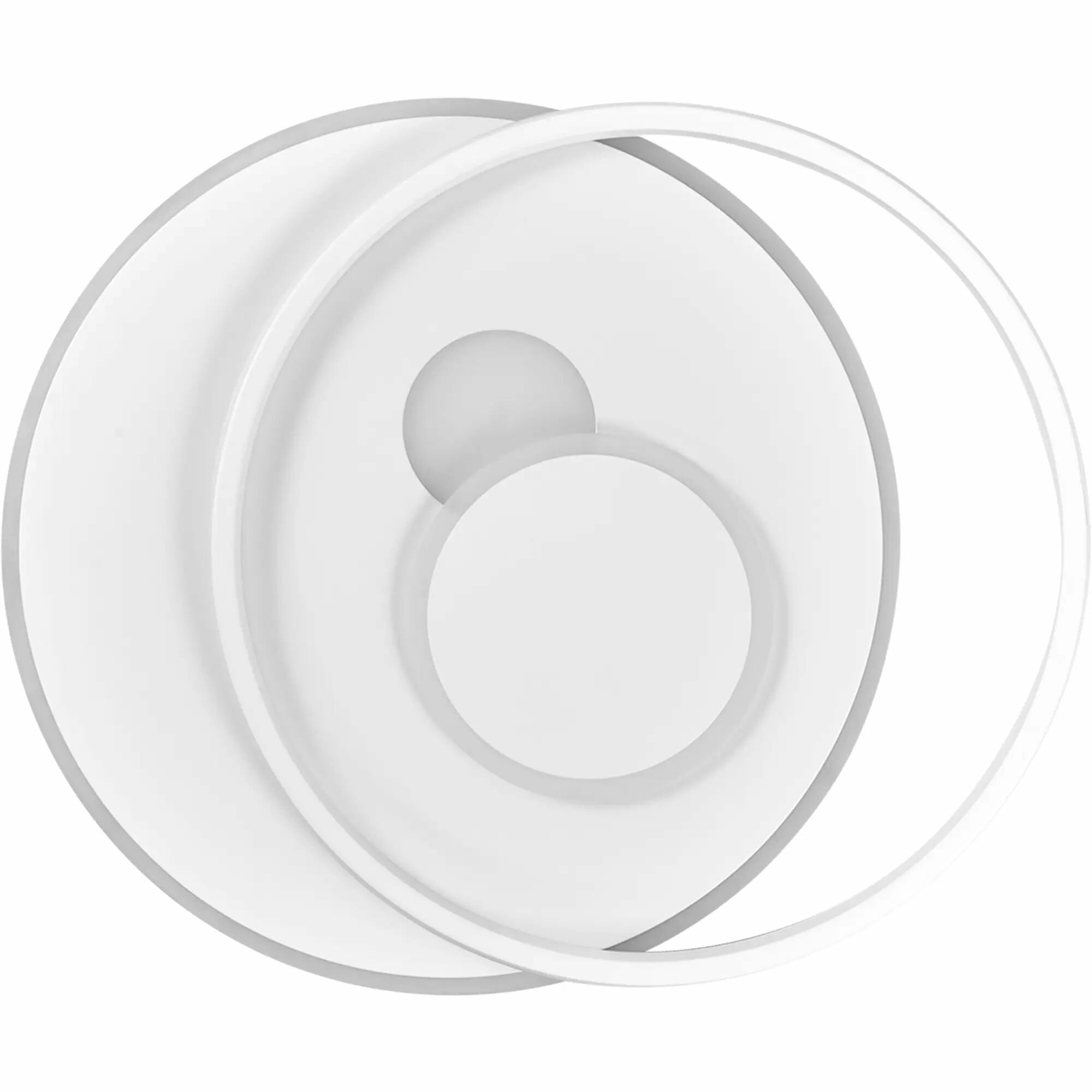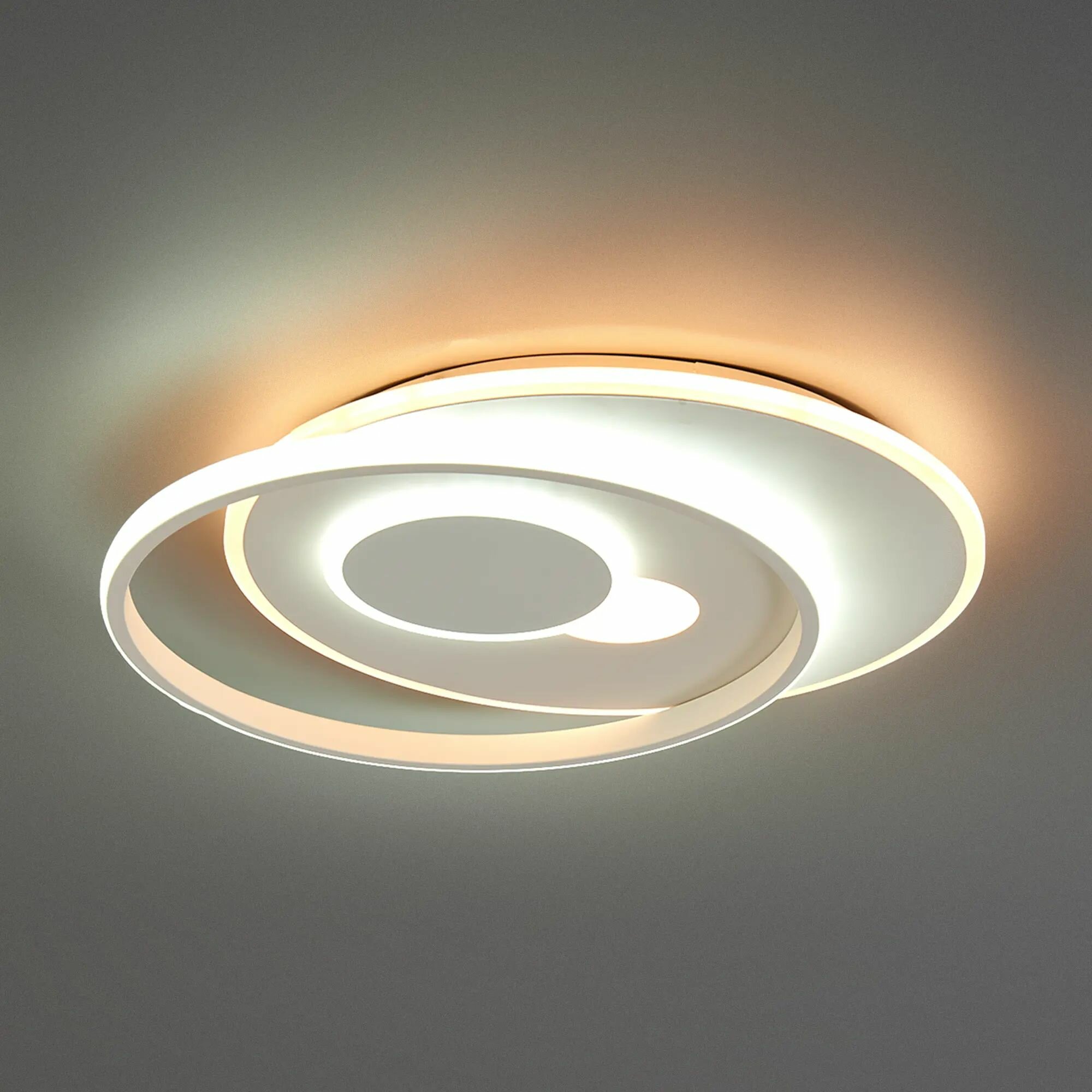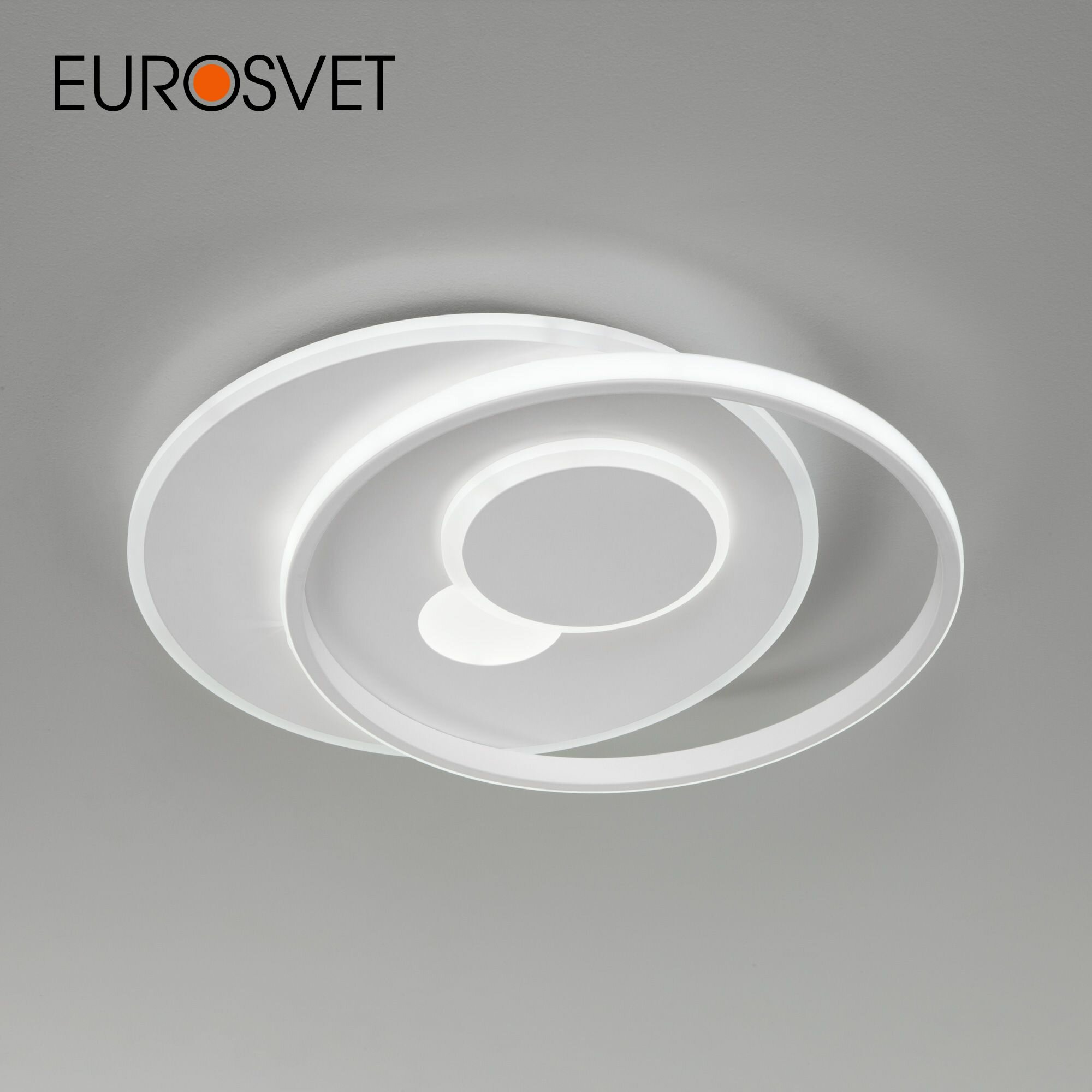 **Светильник потолочный светодиодный Eurosvet Caroline 90256/1** предназначен для эксплуатации внутри помещений. Подходит для освещения площади до 15 м². Конструкция выполнена в виде двух тонких металлических кругов с матовым покрытием белого цвета. Световой поток направлен вниз. Есть возможность регулировки оттенков белого света с помощью пульта ДУ.
