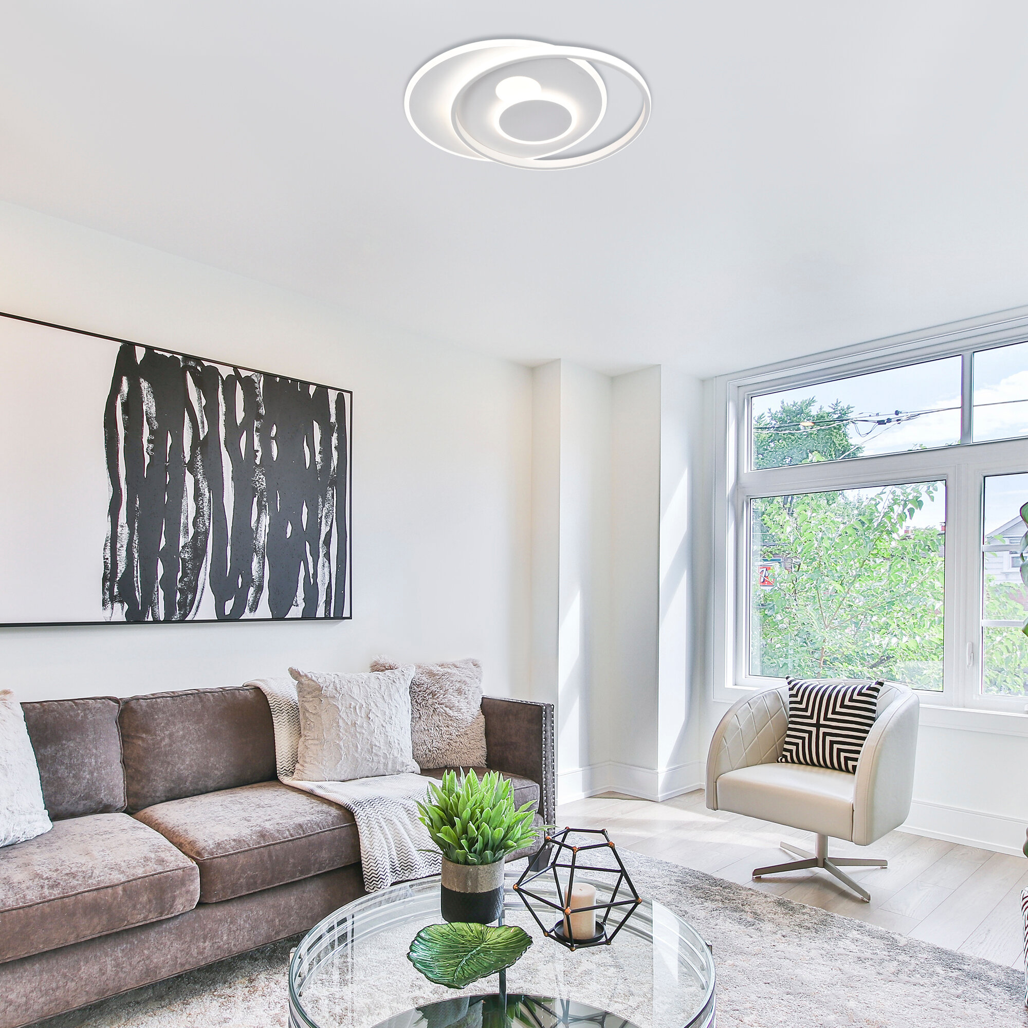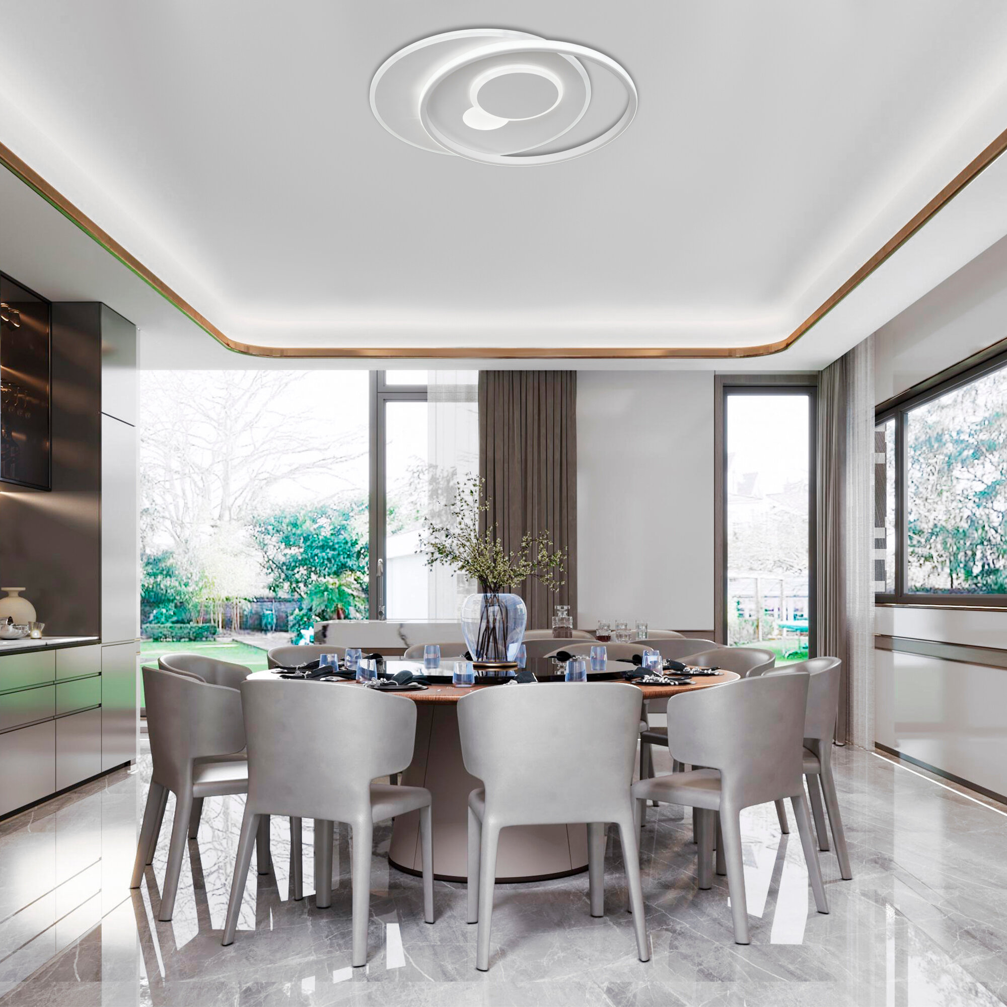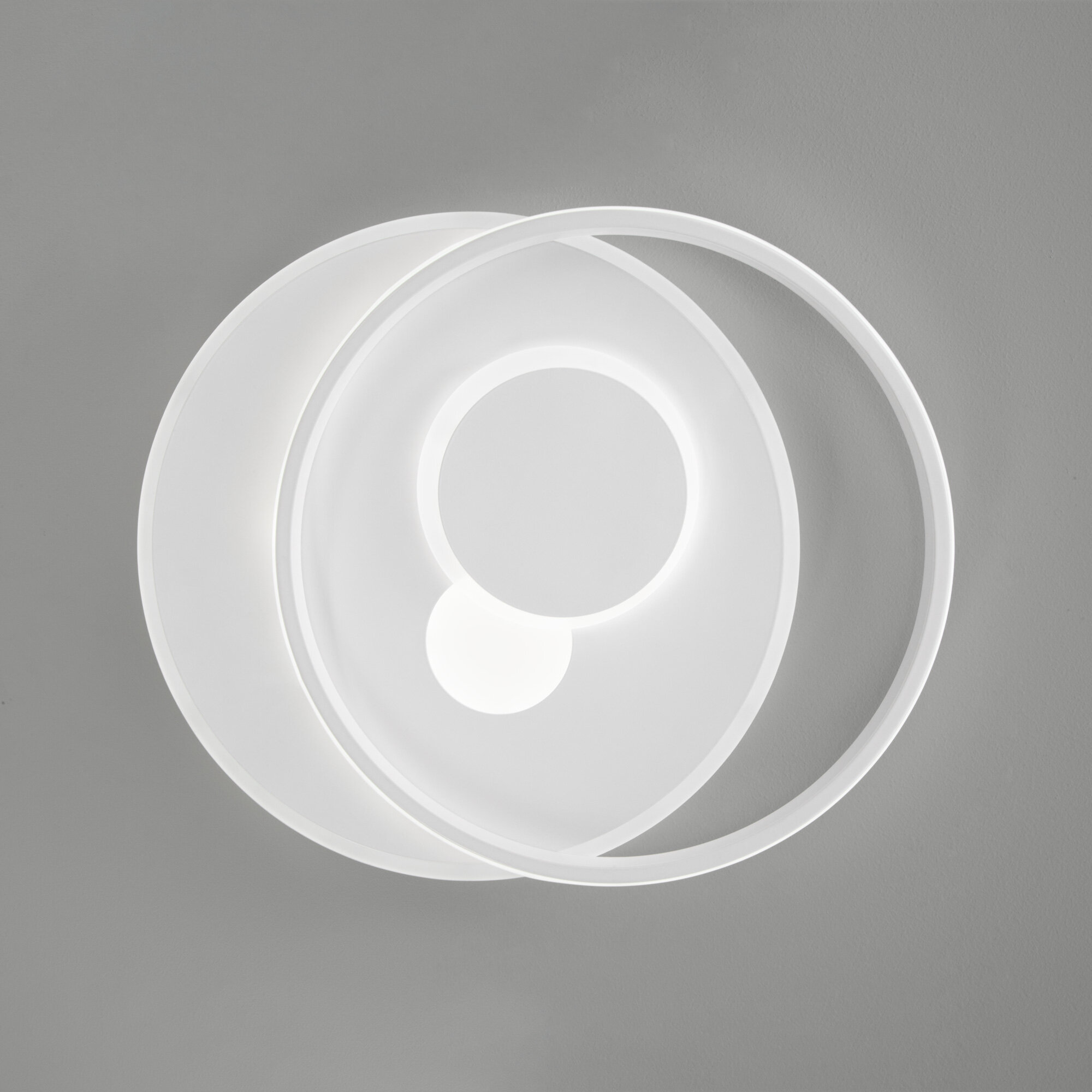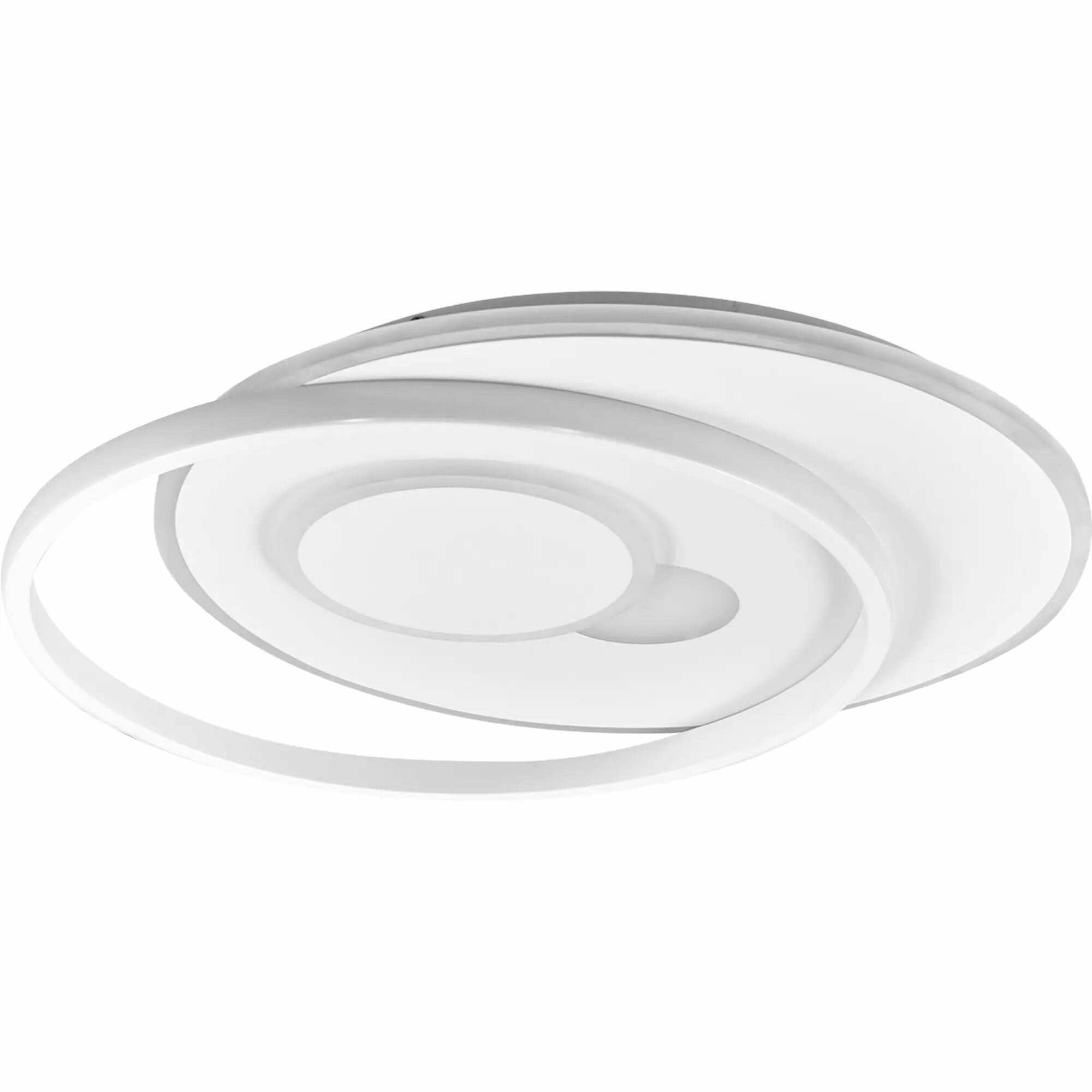 **Светильник потолочный светодиодный Eurosvet Caroline 90256/1** предназначен для эксплуатации внутри помещений. Подходит для освещения площади до 15 м². Конструкция выполнена в виде двух тонких металлических кругов с матовым покрытием белого цвета. Световой поток направлен вниз. Есть возможность регулировки оттенков белого света с помощью пульта ДУ.