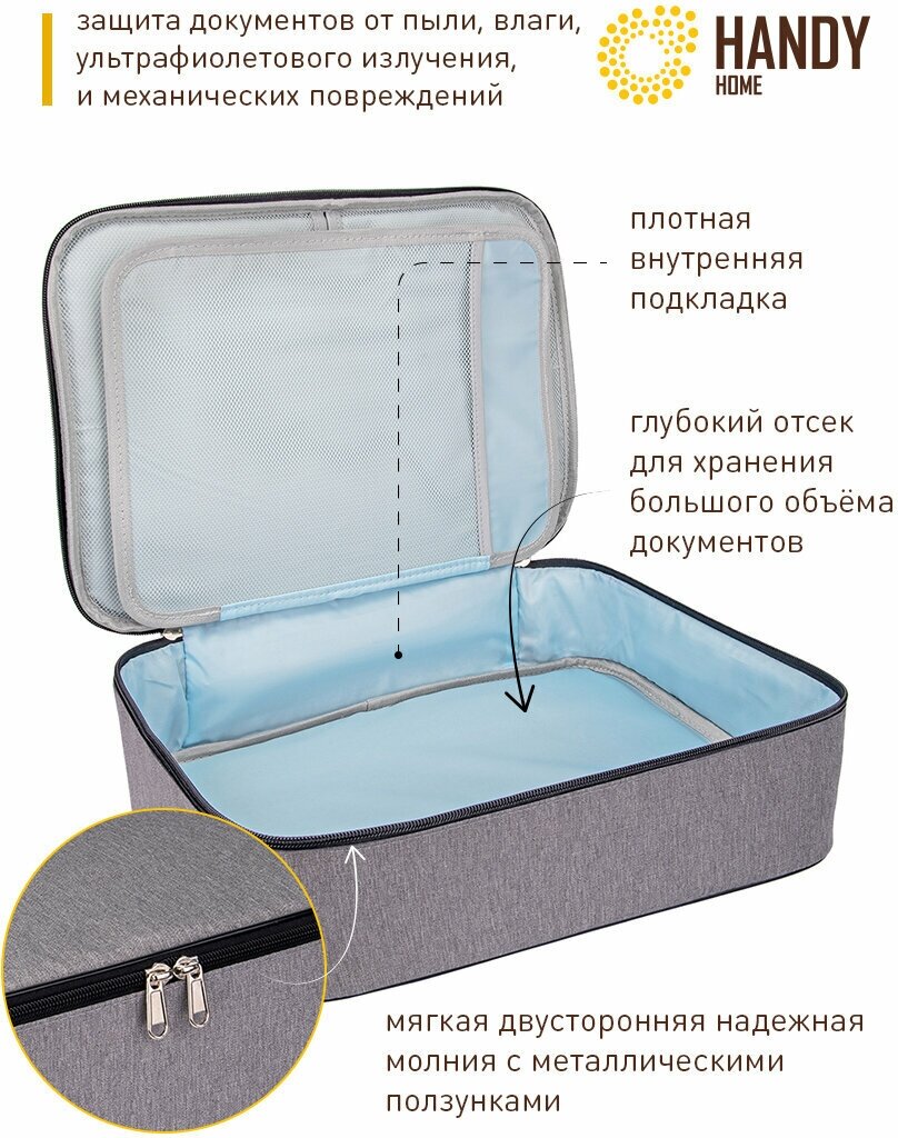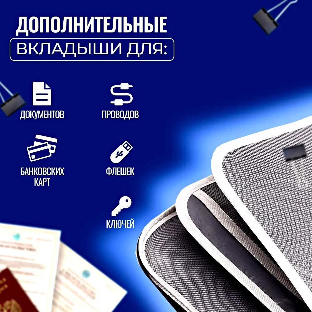 - Молния обеспечивает безопасное хранение документов, а несколько отделений различного размера позволяют хранить как маленькие, так и большие документы.