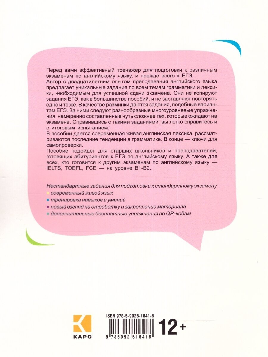 Автор с двадцатилетним опытом преподавания английского языка предлагает уникальные задания по всем темам грамматики и лексики, необходимым для успешной сдачи экзамена. Они не копируют задания ЕГЭ, как в большинстве пособий, и не заставляют повторять одно и то же. В качестве разминки даются задания, подобные вариантам ЕГЭ. За ними следуют разнообразные многоуровневые упражнения, намеренно составленные чуть сложнее тех, которые ожидают на экзамене. Справившись с такими заданиями, вы легко справитесь и с итоговым испытанием.