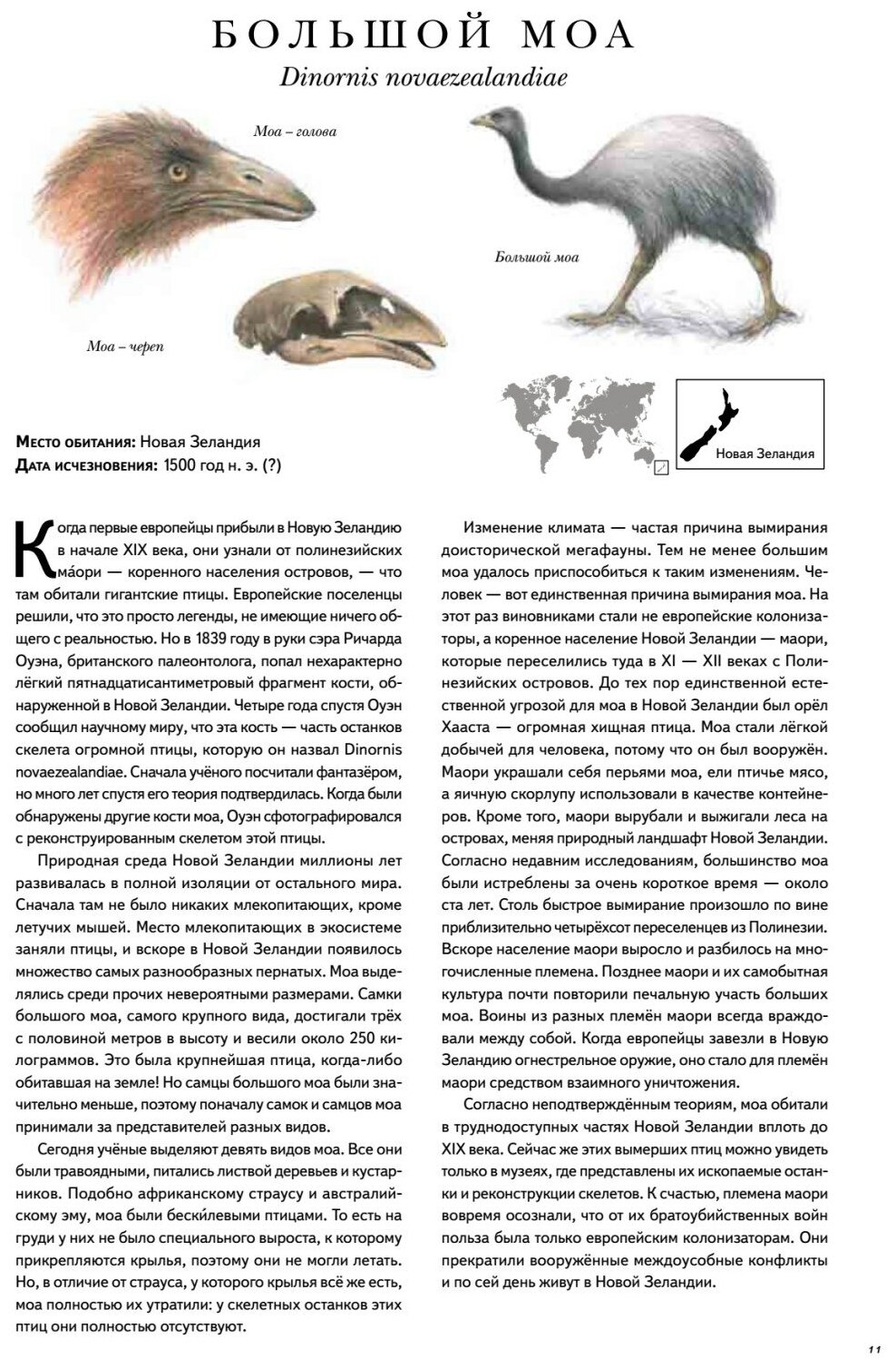 Очень качественная и интересная книга. Это не просто детская книга с картинками исчезнувших животных, это история. История эволюции и описание причины полного исчезновения многих животных, больших и маленьких. Это история каждого из них с очень качественными иллюстрациями, в которых описали все мелочи. Даже выбранный большой размер издания играет значение. Такая книга откроет для ребенка новый мир, а так же заставит, возможно впервые, задуматься об экологии и общем взаимоотношении людей и животных, это перерастет в новый опыт ребенка, а возможно и в полезные привычки. Помню, как в детстве подобные энциклопедии были моими любимыми и такие книги целыми сериями стояли на моих полках. Мне кажется, что какое либо изучение животных всегда будет интересно и взрослым, и детям. Задуматься сейчас, такое изучение гораздо полезнее и гуманнее, нежели поход в зоопарк, учитывая всю трагедию. И все же, это эволюция и обычное течение жизни, там, где особо сильно не постарался человек. Сейчас же, человек, (промышленность, застроения и тд) - главная причина исчезновения разных животных. С целью поведать об этом новому поколению, а может и напомнить взрослым, и была сделана эта книга.
