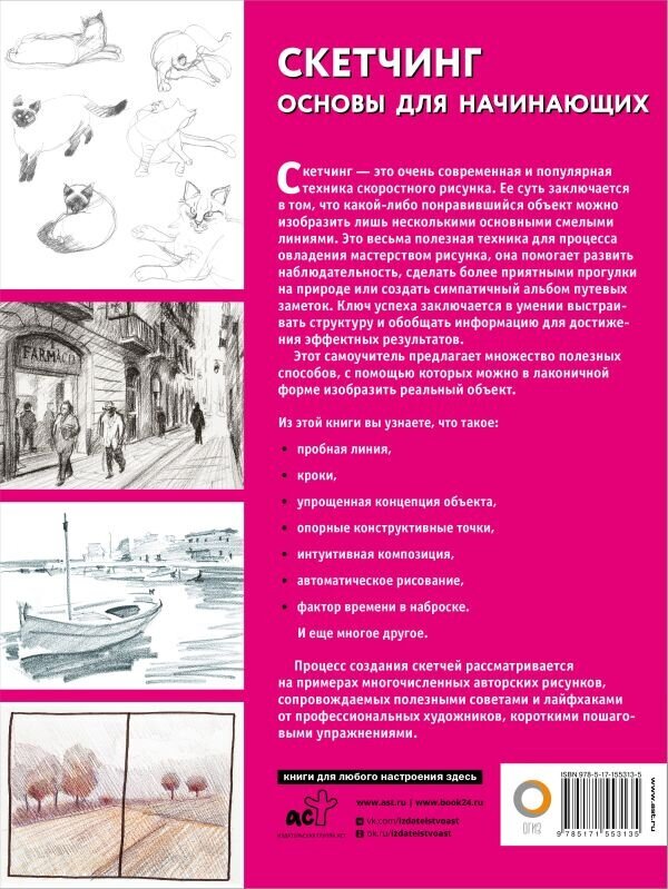 Скетч в переводе означает набросок, владение навыком быстрого наброски очень важено на первых этапах построения рисунка. Здесь главное научиться увидеть характер формы и суметь быстро передать её на бумаге, облегчает при задаче построения композиции. Этот самоучитель поможет овладеть необходимыми навыками и знаниями в скетчинге. Оформление приятное. Также радует, что рассматриваются различные темы рисунка, от натюрморта до человека.