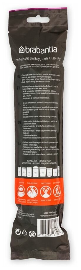 Мешки для мусора Brabantia PerfectFit специально изготовлены для баков Brabantia и идеально подходят к ним по размеру. Очень прочные, со стягивающей лентой, потянув за которую, Вы легко достанете мешок из бака и, стянув горловину, легко вынесете мусор. Для выбора мешков нужного размера используйте буквенно-цветовой код на внутренней поверхности крышки Вашего бака. Идеально опрятно, идеально удобно!