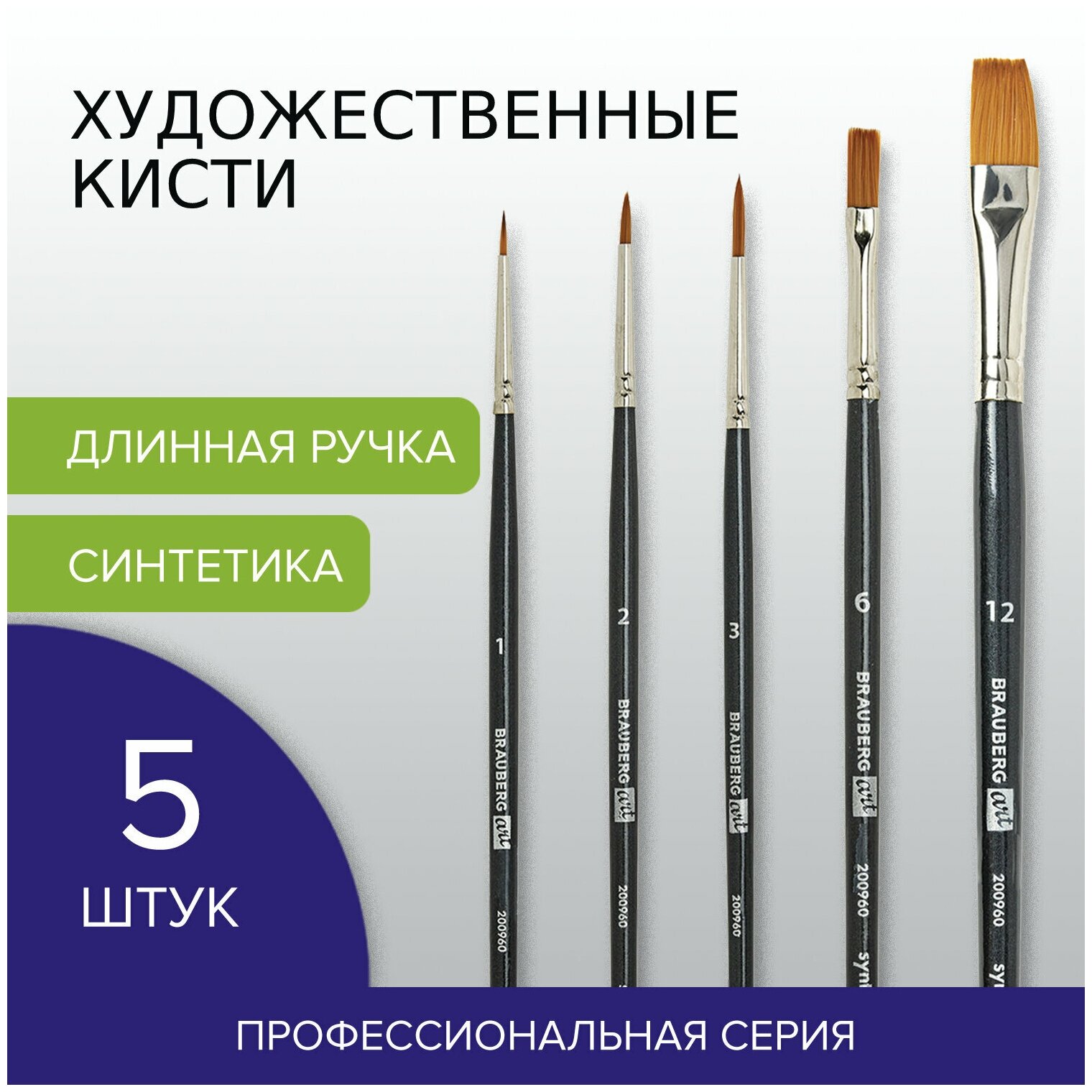 Кисти изготовлены с применением синтетики. Отличаются универсальностью в использовании, обусловленной упругостью ворса и прекрасными впитывающими свойствами пучка. Короткая ручка из древесины покрыта лаком, что защищает ее от воздействия красок и влаги. Форма пучка - овальная № 10, 18, 22; веерная № 4; плоская № 16, 24; круглая № 8, 10; скошенная № 6, 12, 20, 24; лайнер №1, 2, 5. Номер кисти соответствует реальной ширине пучка в миллиметрах.
