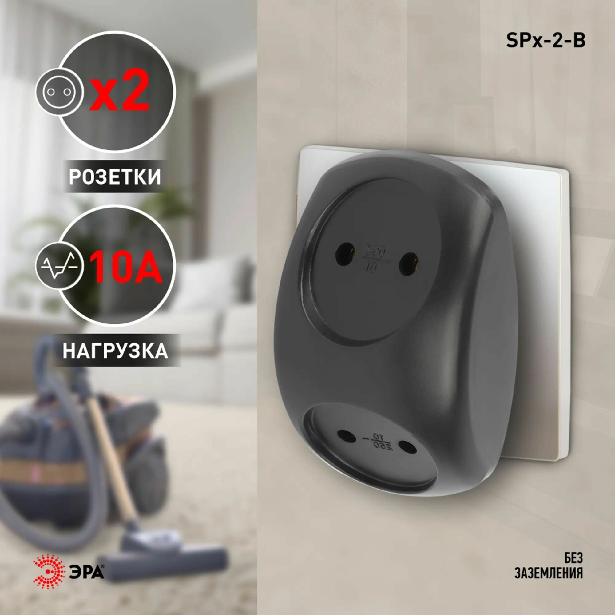 Сетевой разветвитель (тройник) ЭРА SPx-2-B на 2 розетки, без заземления. Цвет-черный. Максимальная мощность - 10А/2200 Вт, материал корпуса - полипропилен (пластик премиум сегмента). Эксклюзивный продакт-дизайн.