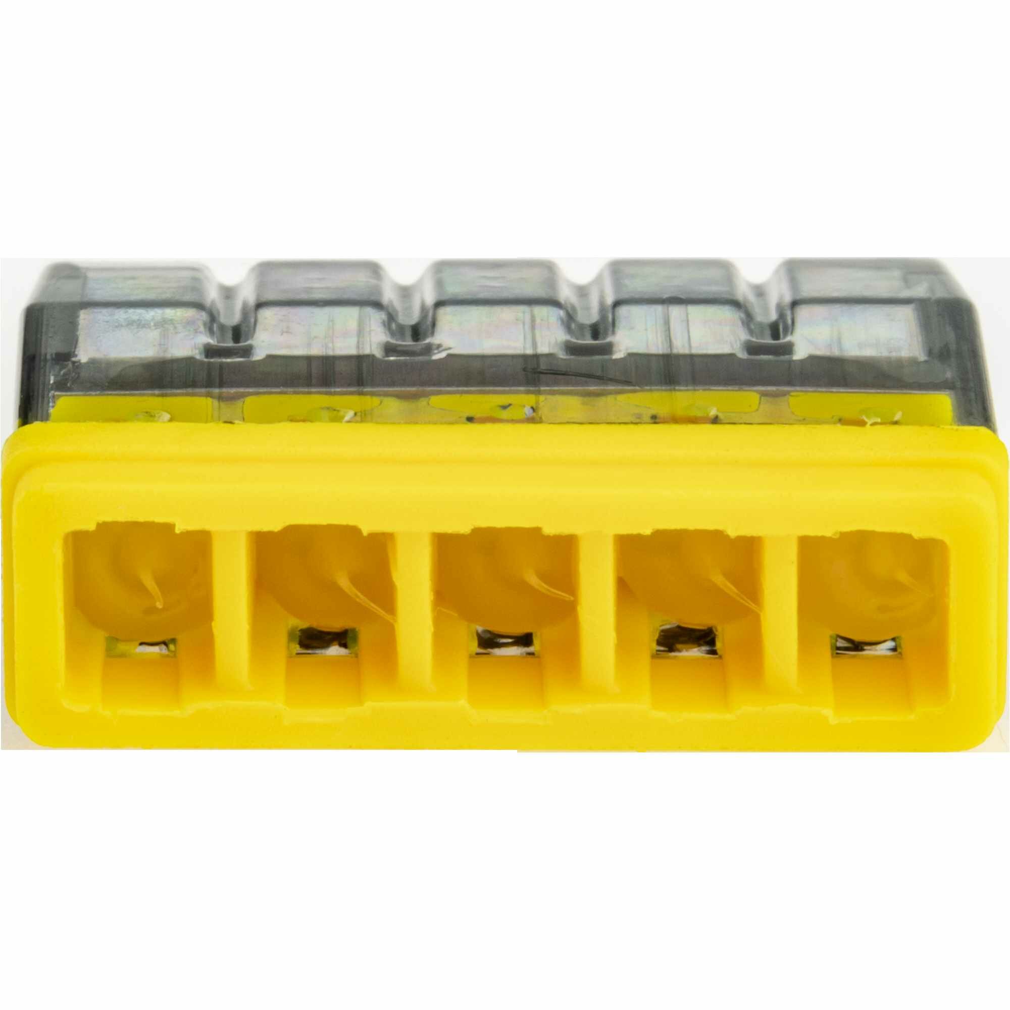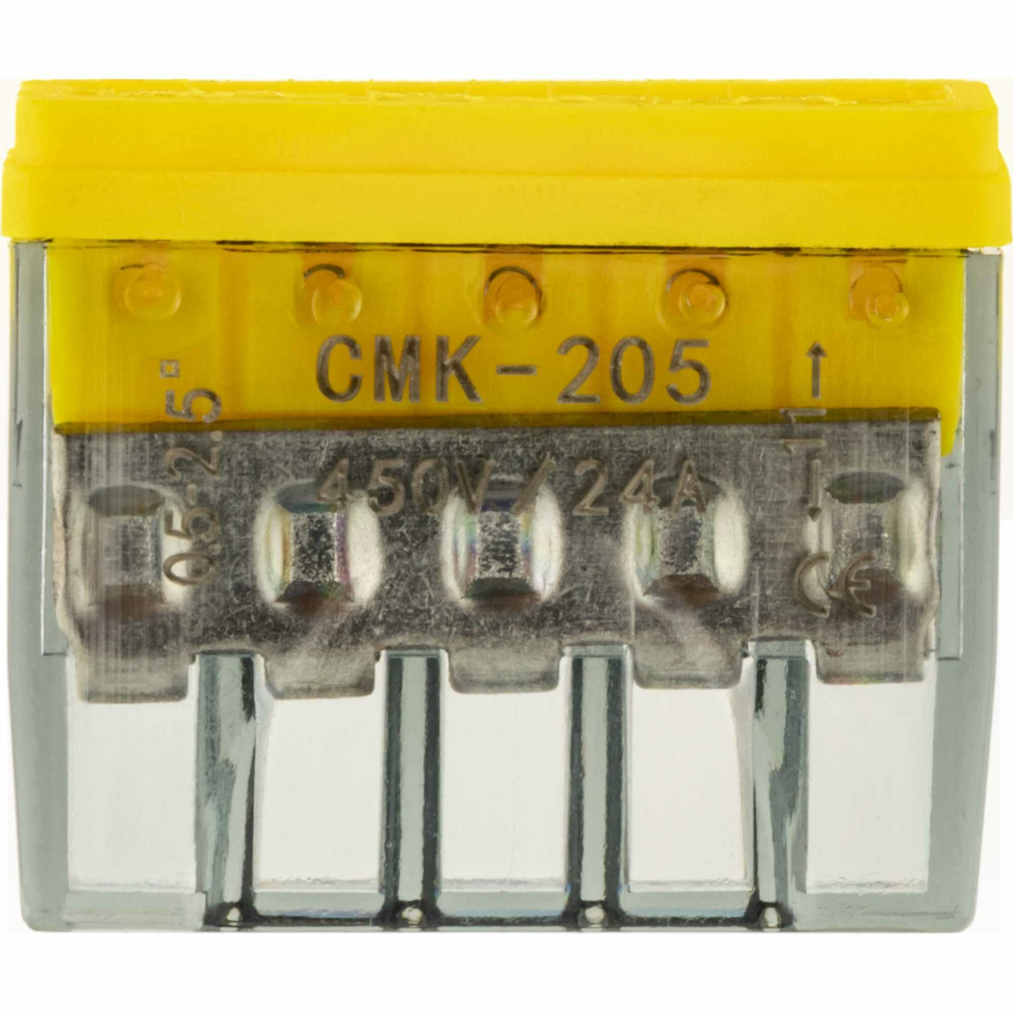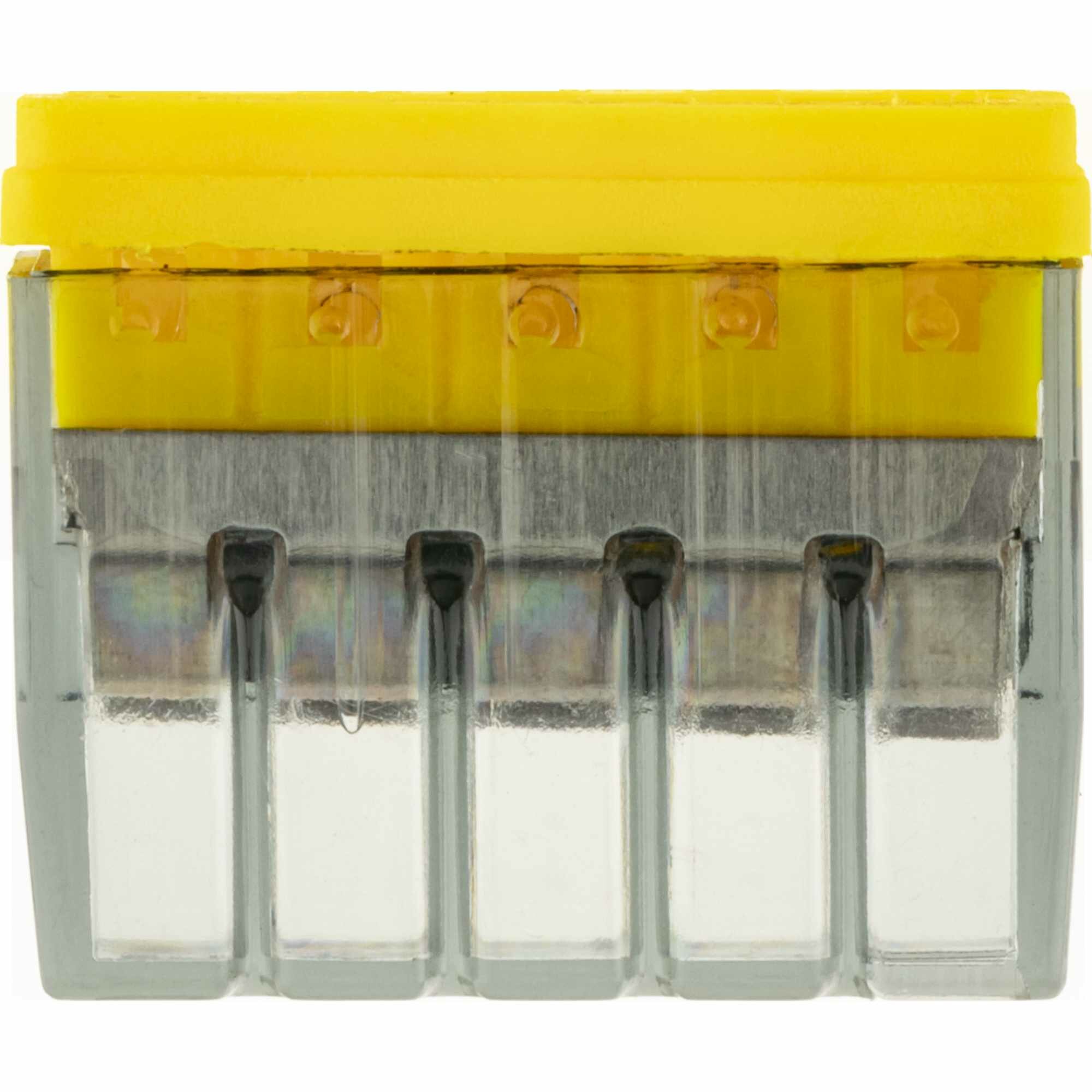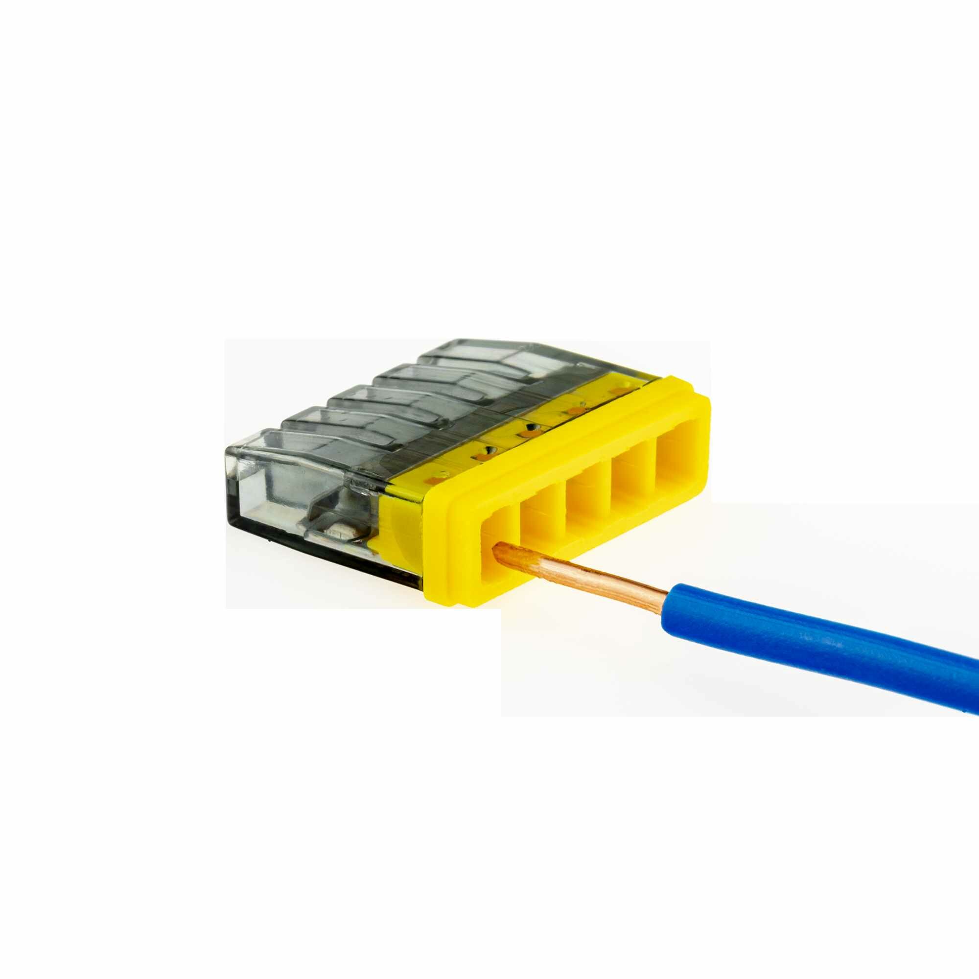 Клеммы соединительные самозажимные монтажные прозрачные 5-ти контактные. В наборе 5 шт. Предназначены для соединения одножильных и многожильных медных проводов, защищая их от повреждения и исключая возможность замыкания. Для соединения алюминиевых проводников клеммы применяются со специальной пастой, которая входит в комплект. Клеммник используется в цепях переменного и постоянного тока до 450 В. Прозрачный корпус позволяет отследить качество соединения. Основные преимущества: быстрое и простое подключение, монтаж без инструментов, негорючий материал, многократное использование, улучшенная токовая проводимость зажимов, подходит для жесткого и гибкого кабеля, а также многожильных кабелей. Специальные пазы в корпусе исключают возможность случайного отсоединения проводников.