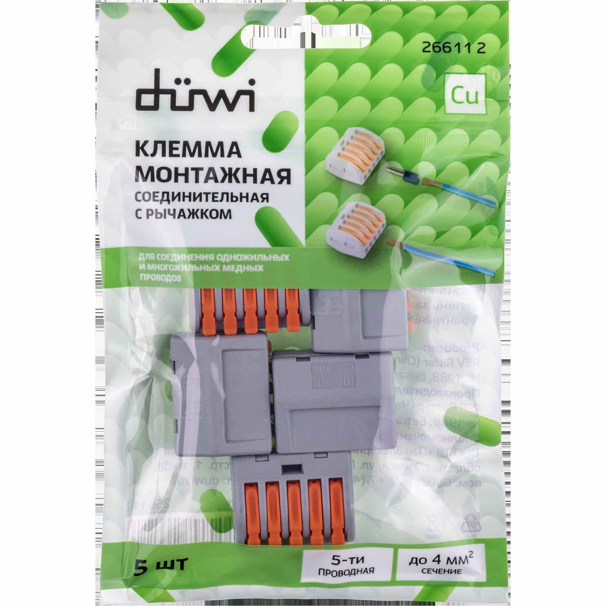 клемма соединительная DUWI 5-проводные 4 кв.мм СМК 222-415 20шт серый (26747 8)