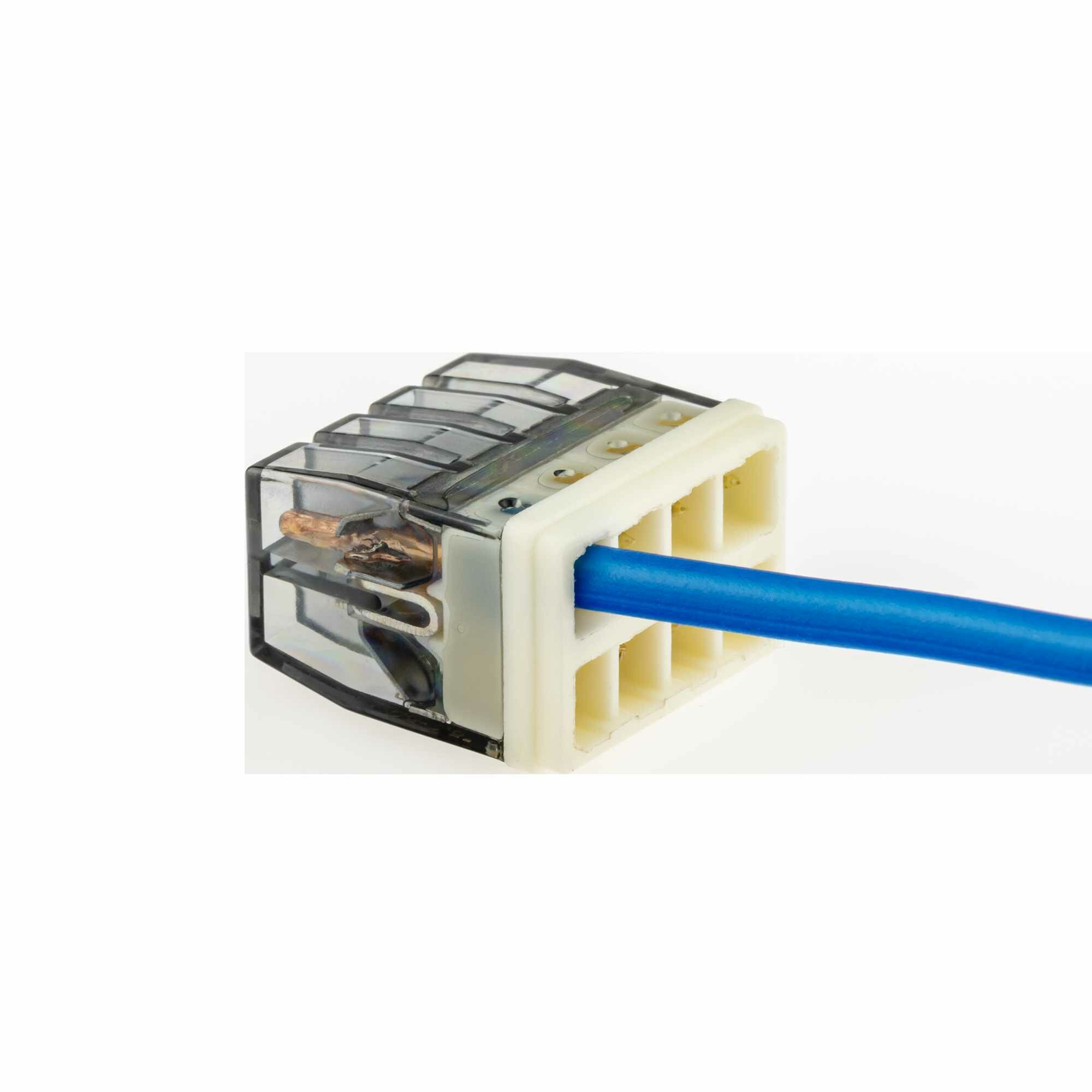 Клеммы соединительные самозажимные монтажные прозрачные 8-ми контактные. В наборе 5 шт. Предназначены для соединения одножильных и многожильных медных проводов, защищая их от повреждения и исключая возможность замыкания. Для соединения алюминиевых проводников клеммы применяются со специальной пастой, которая входит в комплект. Клеммник используется в цепях переменного и постоянного тока до 450 В. Прозрачный корпус позволяет отследить качество соединения. Основные преимущества: быстрое и простое подключение, монтаж без инструментов, негорючий материал, многократное использование, улучшенная токовая проводимость зажимов, подходит для жесткого и гибкого кабеля, а также многожильных кабелей. Специальные пазы в корпусе исключают возможность случайного отсоединения проводников.