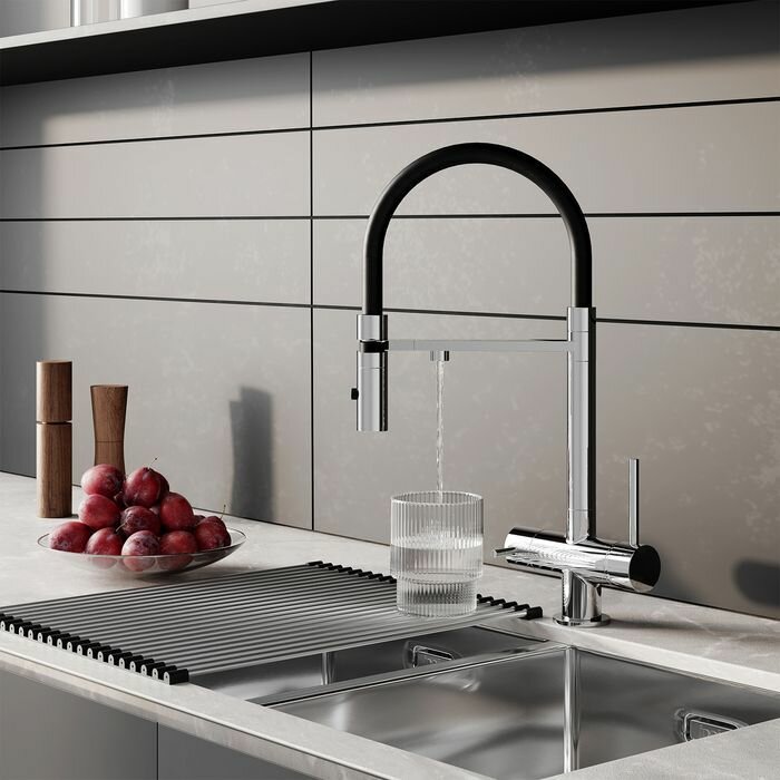 Контрастный черный излив делает хромированный смеситель Ace таким привлекательным. Функциональная модель помогает эффективнее справляться с повседневными задачами на современной кухне. Отдельный канал для фильтрованной воды дает доступ к чистой питьевой воде прямо из-под крана. Гибкий излив позволяет направить струю воды в нужную точку кухонной мойки. При этом руки остаются свободными благодаря держателю для излива на корпусе. Магнитный замок надежно фиксирует излив после использования. • Смеситель IDDIS® прослужит долго благодаря надежному корпусу из прочной латуни, стойкому к коррозии, резким изменениям давления и перепадам температуры воды. • Излив IDDIS® из термостойкого силикона просто содержать в чистоте благодаря гладкой поверхности и высокой устойчивости силикона к грибку. Материал приятен на ощупь и легко моется обычным моющим средством. • В смесителе предусмотрено 2 режима подачи воды: «душ» – для ополаскивания посуды или мытья овощей и фруктов; стандартная аэрированная струя – для быстрого наполнения емкостей. Переключение между режимами производится простым нажатием кнопки на изливе. • Гарантия на смесители IDDIS® — 10 лет.