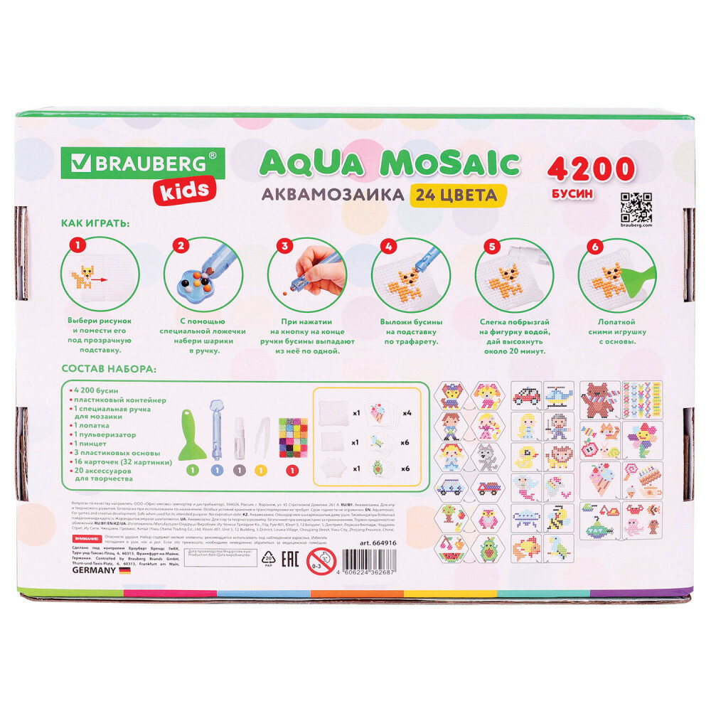 Аквамозаика BRAUBERG KIDS - это набор специальных бусин для создания картинок на трафаретах, входящих в набор. Бусины склеиваются между собой, если побрызгать на них обычной водой. Аквамозаика развивает у ребёнка усидчивость и креативное мышление.