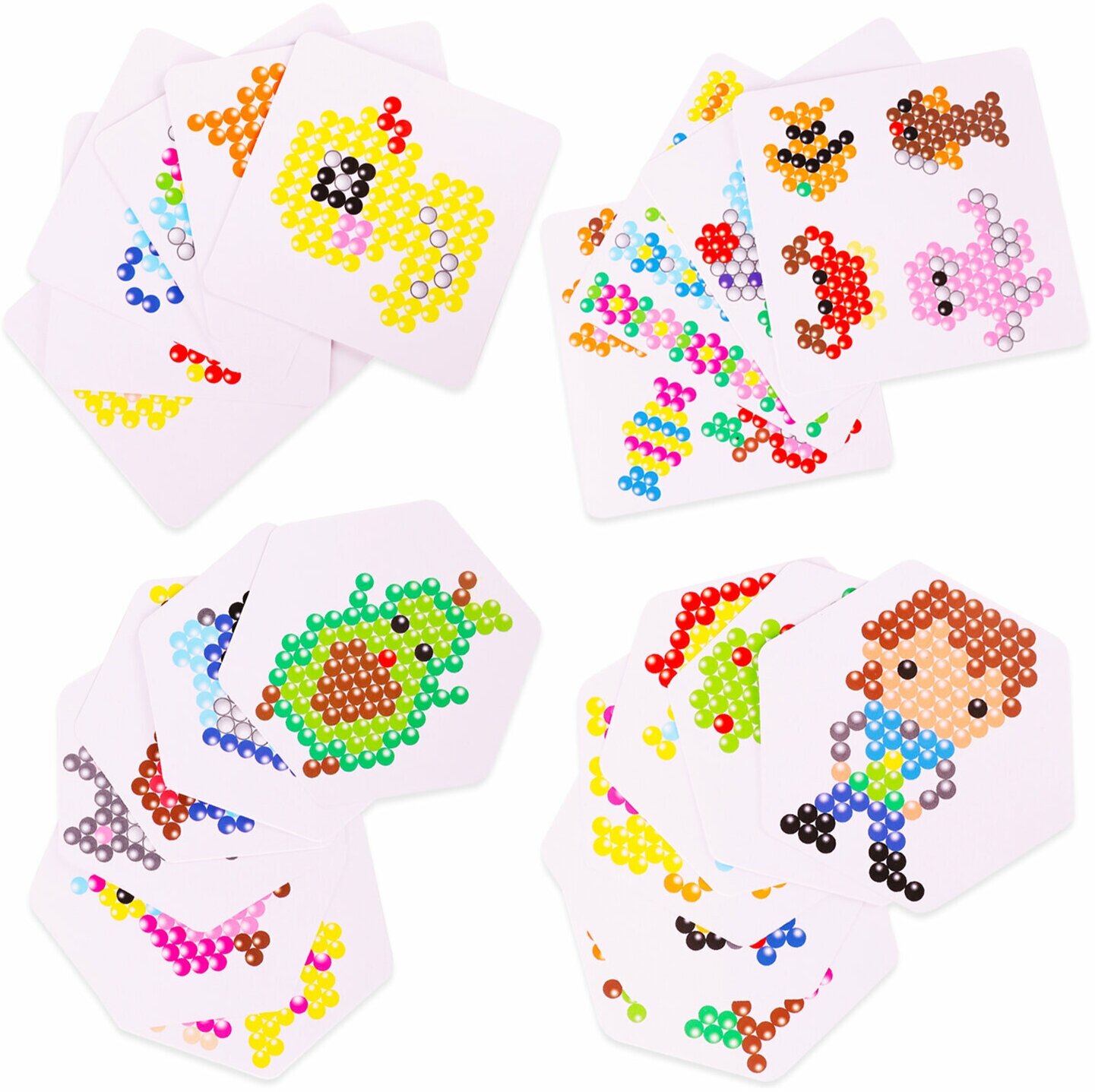 В набор входят бусины 24 различных цветов, около 100 штук каждого цвета, пластиковый контейнер с отсеками для удобного хранения бусин, 3 подставки-трафарета, 16 двусторонних карточек с картинками, бутылочка-пульверизатор для воды, специальная ручка для аквамозаики, лопатка для снятия готовой фигурки с трафарета, а также основы для браслета и других украшений, колечки и крепления для создания брелков, подвесок и других игрушек из бусин.