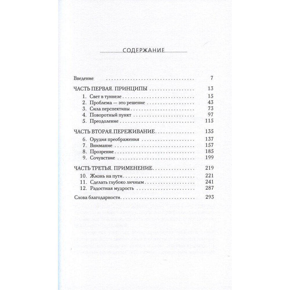 "Буддизм, - продолжает автор, - предлагает третью возможность. Мы должны увидеть в разрушительных эмоциях и других испытаниях, встречающихся на нашем жизненном пути, простые ступени, помогающие нам подниматься вверх, к свободе. Вместо того чтобы отвергать эти аспекты человеческого бытия или становиться их жертвами, мы можем превратить их в своих друзей и использовать для культивации таких внутренне присущих нам качеств, как мудрость, уверенность в себе, ясность и радость".
