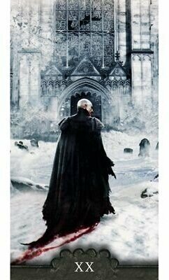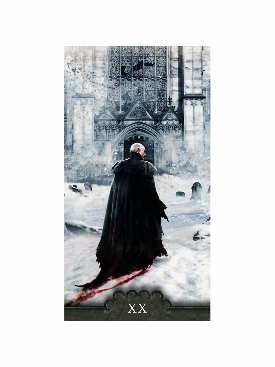 Отсутствие в продаже этой колоды в данной форме выпуска говорит о её популярности и востребованности. Бюджетная версия вампирской колоды выполнена на тоненьком картоне, под матовым гладким покрытием. Колода очень хорошей вырубки с тематическим кровавым рисунком рубашки и безрамочными арканами. Размер карт 11,3*6 см. Весьма подходящая замена, если нет возможности приобрести полноформатную колоду.