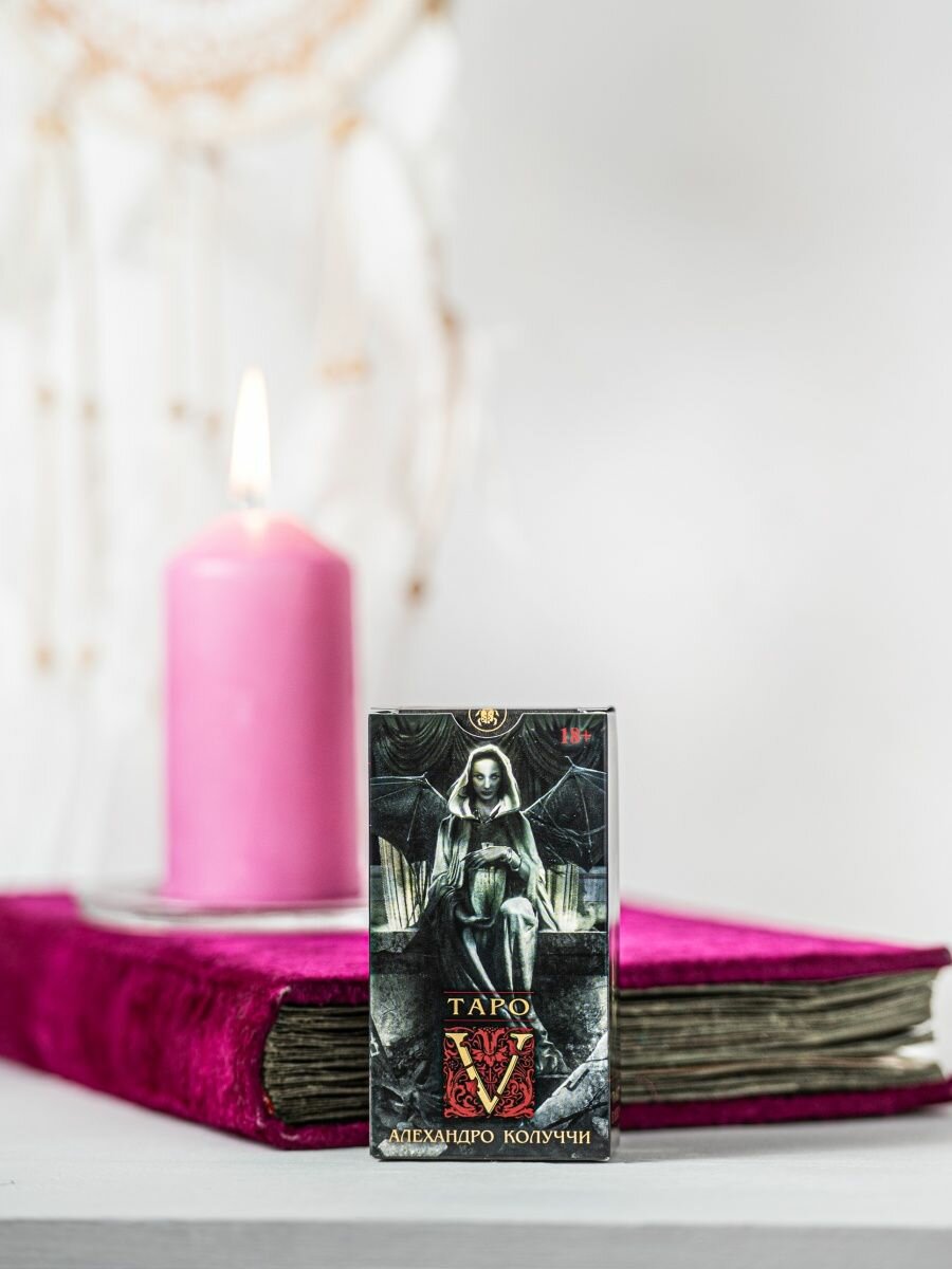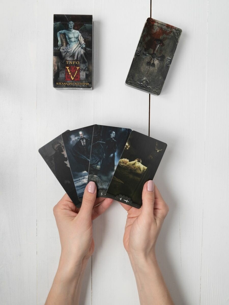 V - Вампиры. Это Таро продолжает серию колод итальянского художника Алехандро Колуччи, начатую им в "Таро Z" - Зомби. Таро переносит нас не в мир фантазий или ощущений, а возвращает к истокам нашей первобытной сущности, где стерта грань между живым существом и монстром, который прячется внутри каждого человека. Но внутри каждого монстра есть человек.