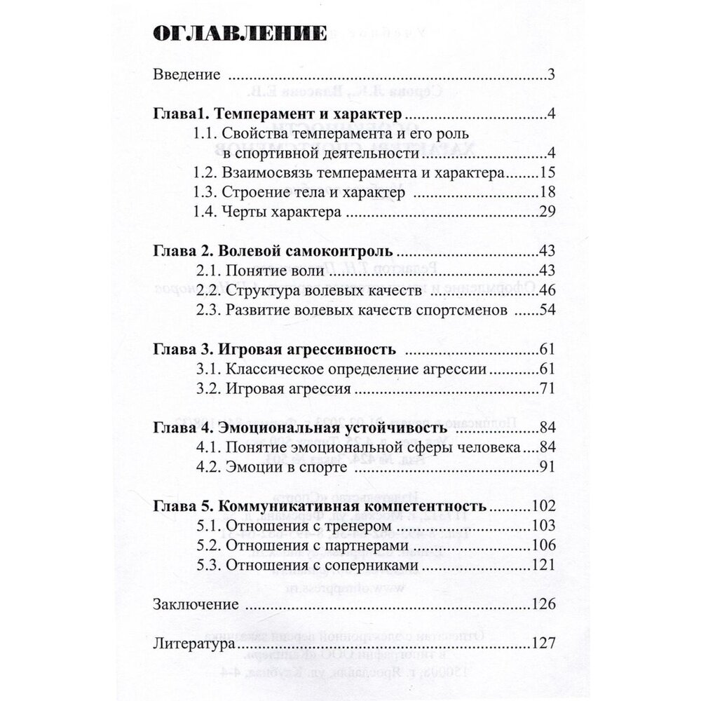 В книге даются понятия темперамента и характера, раскрывается их взаимосвязь и роль в спортивной деятельности. Рассматриваются такие качества характера спортсменов, как волевой самоконтроль, игровая агрессивность, эмоциональная устойчивость, коммуникативная компетентность. Наряду с определением данных черт характера даются рекомендации по развитию этих качеств у спортсменов.