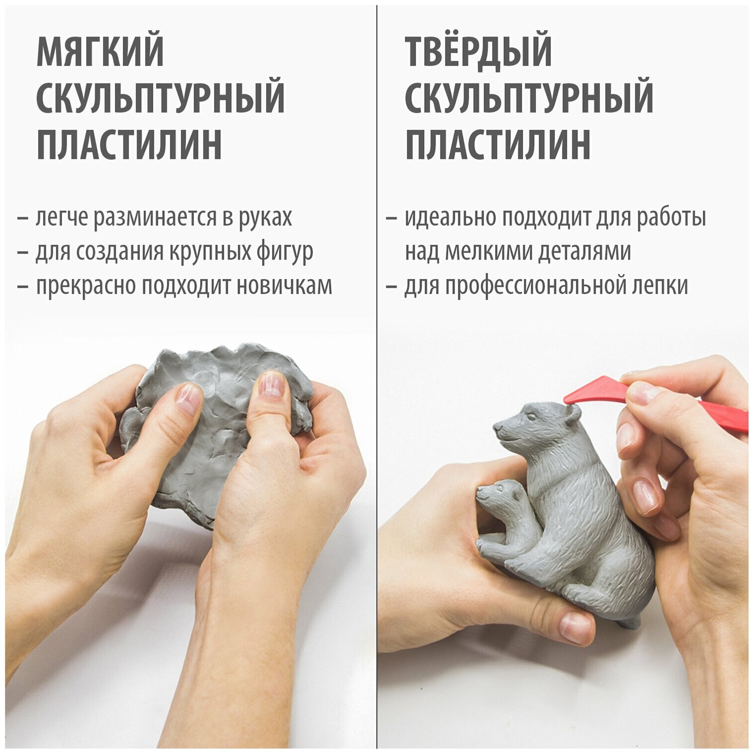 Отлично держит форму и устойчив к перепадам температуры. Не оставляет пятен, не липнет к рукам. Твердый пластилин необходимо дольше разогревать, фигуры из такого пластилина лучше сохраняют форму. Пластилин весом 0,5 кг упакован в полипропиленовую пленку.