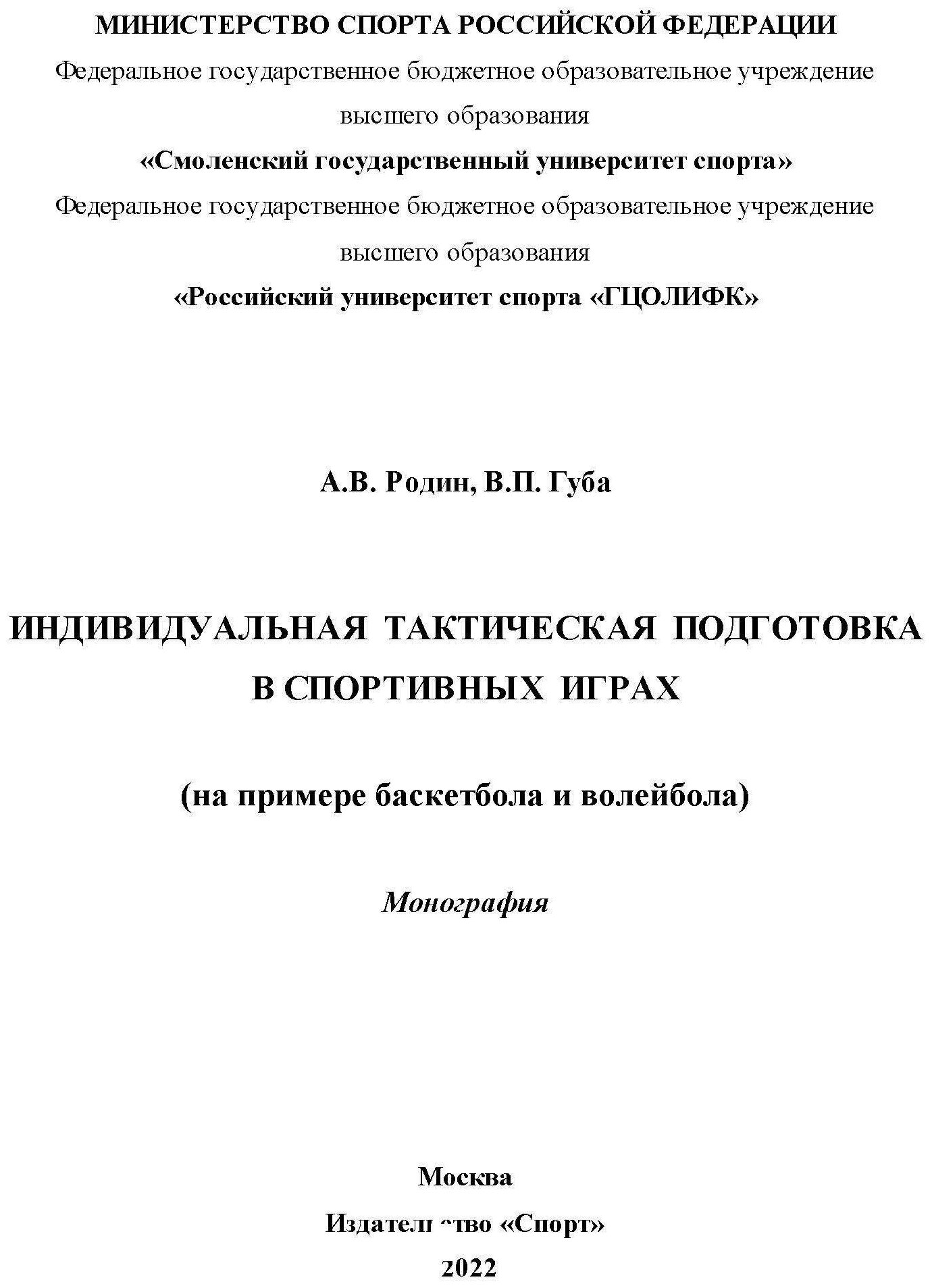 Индивидуальная тактическая подготовка в спортивных играх на примере баскетбола и волейбола (Губа Владимир Петрович, Родин Андрей Викторович); Спорт, 2023