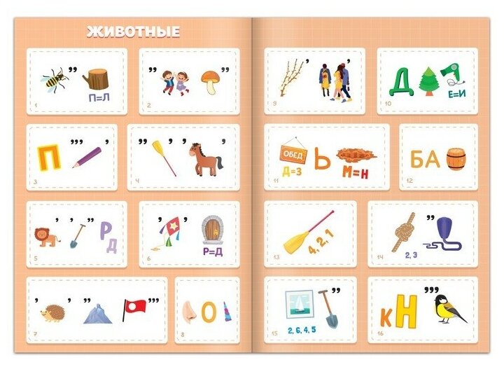 Внутри вы найдёте ребусы на разные темы: дом, животные, сказки, спорт, транспорт и др.