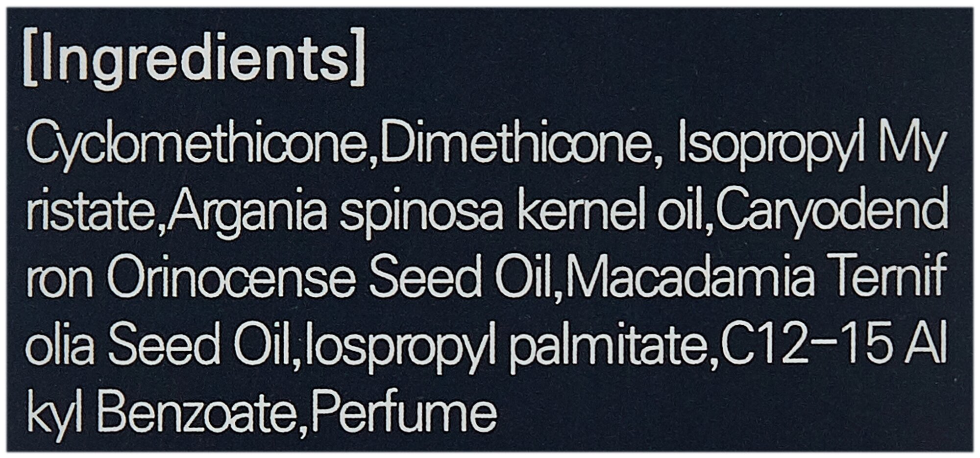 | Состав | Cyclomethicone, Dimethiconol, Isopropyl Myristate, Macadamia Nuts Oil, Isopropyl palmitate, Caryodendron Orinocense Seed Oil, Argania spinosa kernel oil, Dimethicone, Perfume |