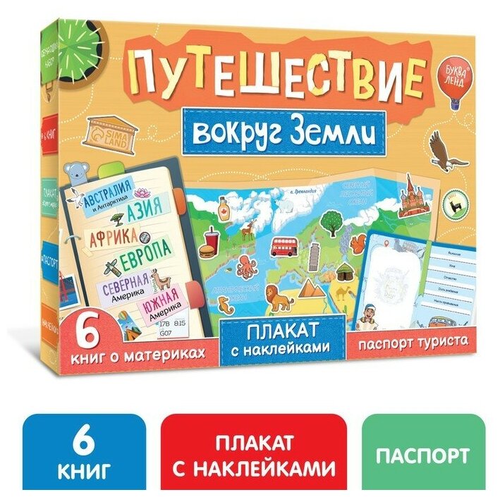 Набор Путешествие вокруг Земли. 6 книг карта мира паспорт наклейки (Соколова Юлия Сергеевна); Буква-ленд, 2022