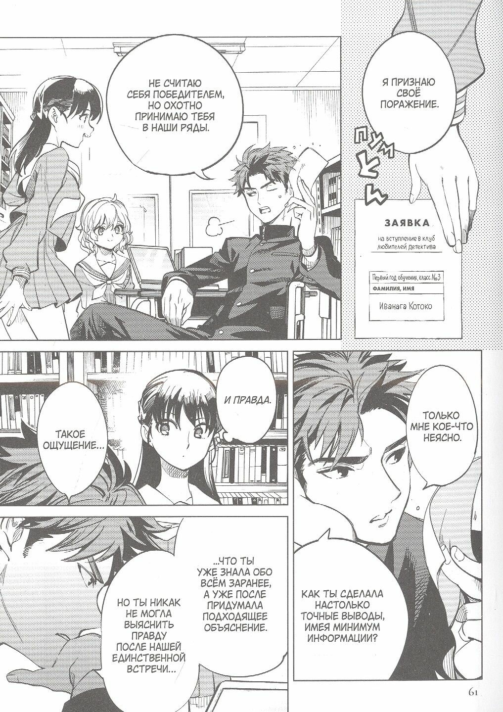 Манга «Ложные выводы» стала моим путеводителем и лучиком надежды, когда я окончательно разочаровалась в его экранизации, которая была до жути скучна и не интересна. Именно в манге почему-то есть какая-то атмосфера, что не даёт тебе уходить от предвкушения. Рисовка не менее потрясающая, порой я залипала на некоторые странички, рассматривая главную героиню. Шикарное произведение, которое достойно вашего внимания
