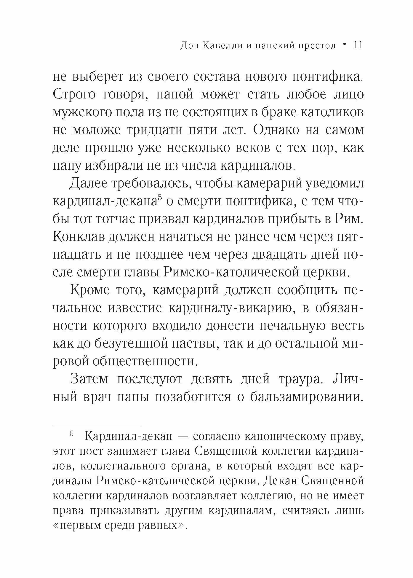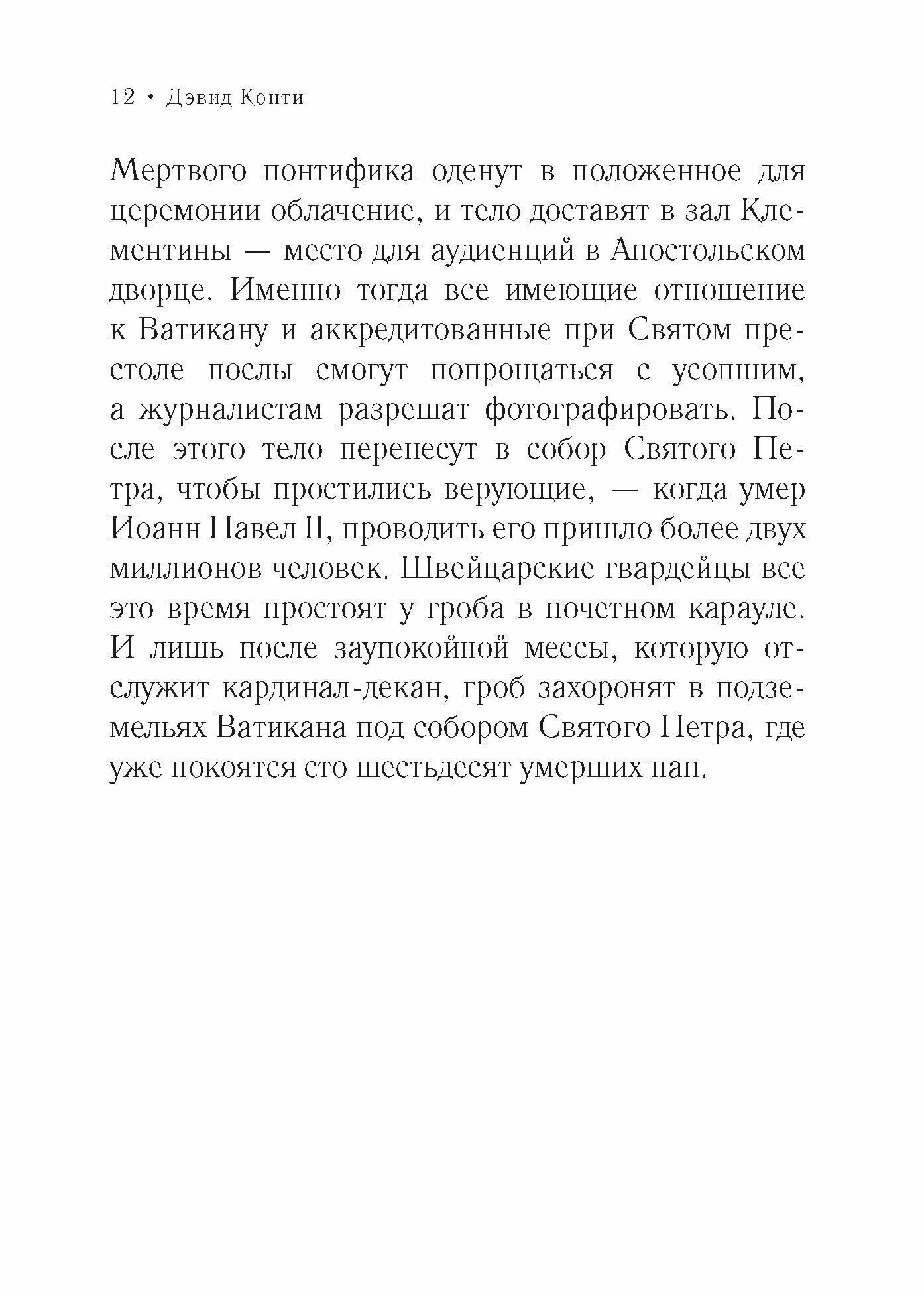 Автор умело пишет о сложных взаимоотношениях внутри кардинальского конклава и раскрывает тайны, связанные с выбором нового папы. Главный герой, Донато Кавелли, кажется неуклюжим и неловким, но его ум и настойчивость помогают ему раскрыть многие тайны и разоблачить заговор. Книга написана в легком и понятном стиле, что позволяет читателю легко погрузиться в сюжет и наслаждаться его развитием. Отдельно стоит отметить красивое оформление книги и отличный перевод на русский язык. В целом, это книга, которую можно порекомендовать любителям детективных историй и поклонникам художественной литературы о Ватикане.