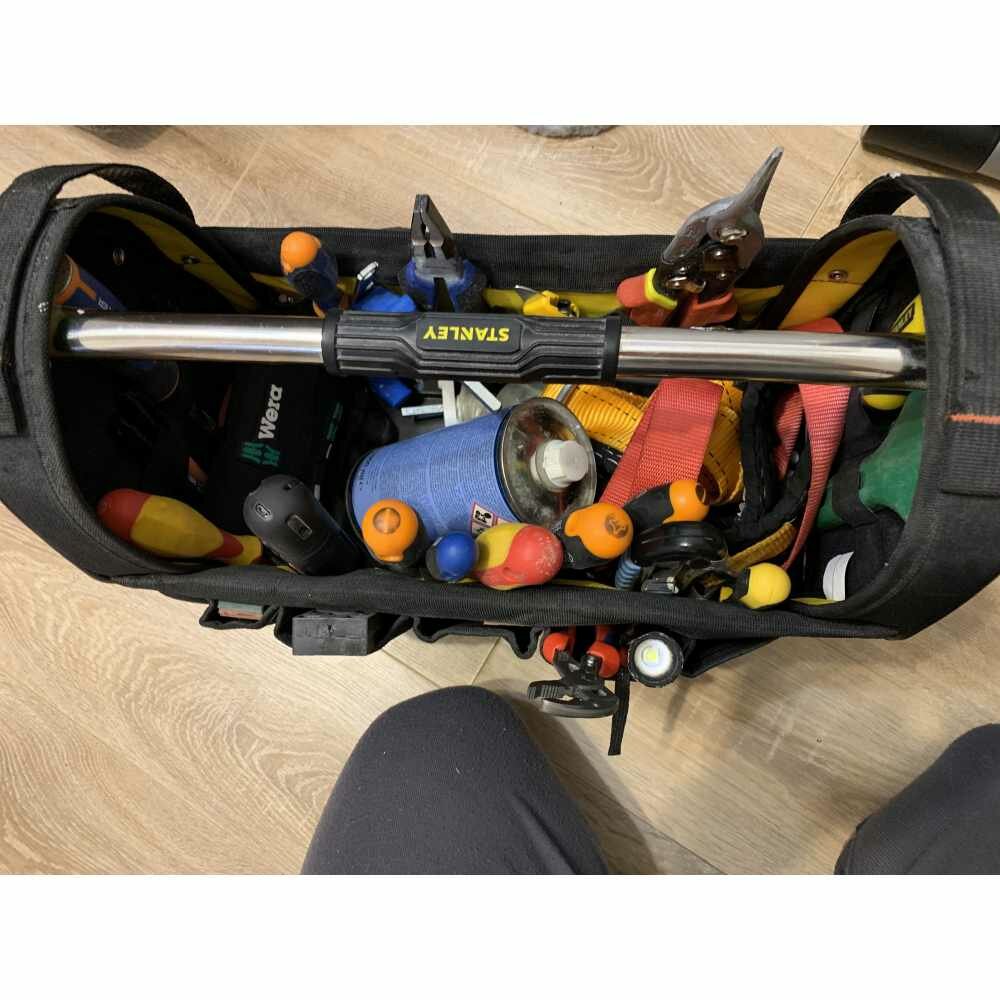Свои инструменты я храню в сумке Stanley FatMax. Она очень удобна. Жесткое пластмассовое водонепроницаемое дно обеспечивает защиту и устойчивость сумки. Она открыта, поэтому все инструменты удобно брать во время работы. Для переноски есть и ремень, и металлическая ручка с резиновой наладкой. Внутри и снаружи множество отделений и карманов разного размера для любых инструментов. Ткань очень прочная и износостойкая.