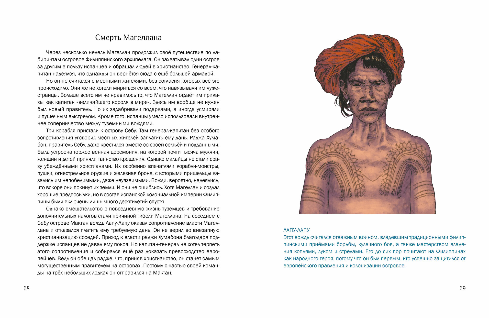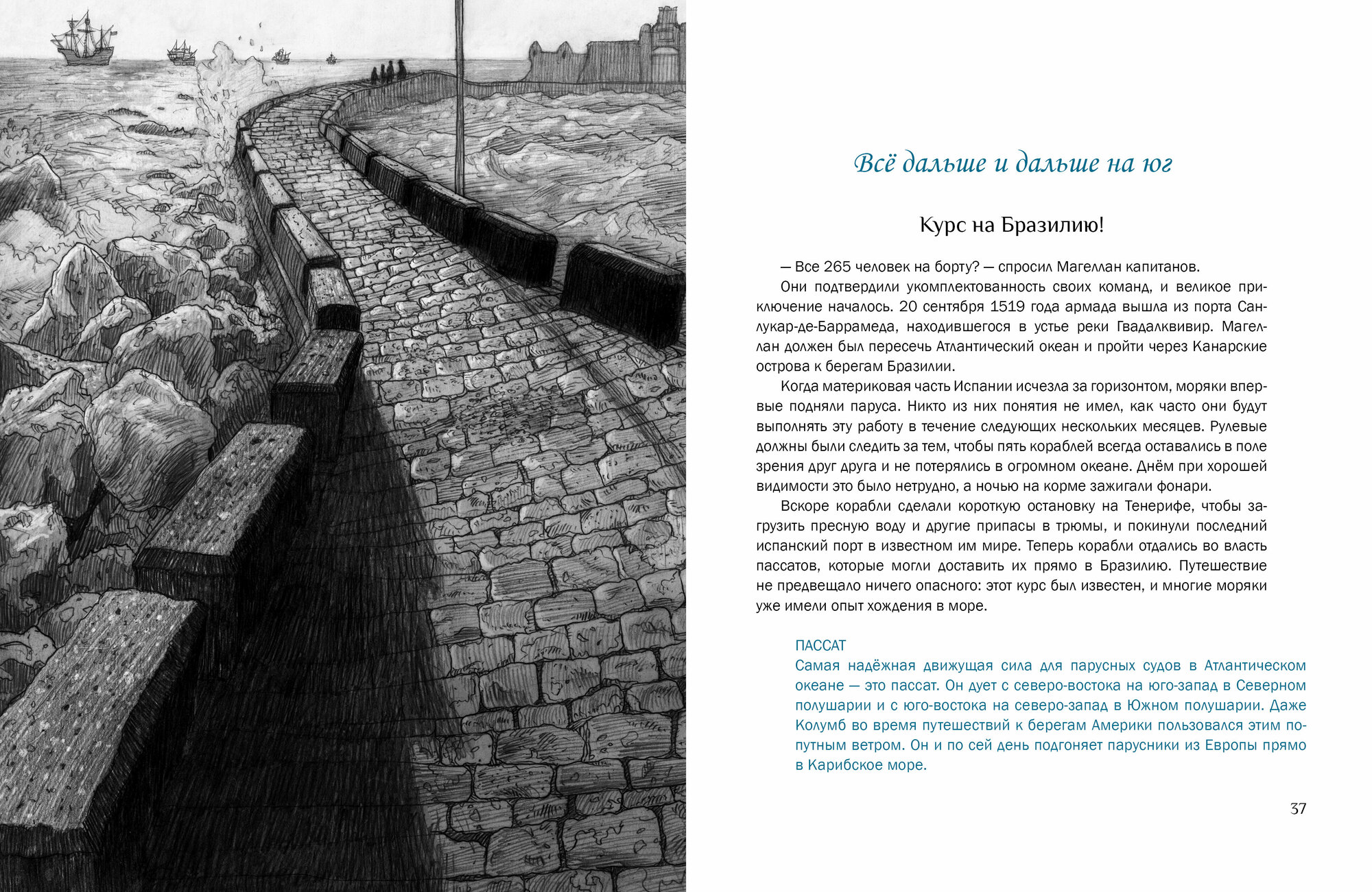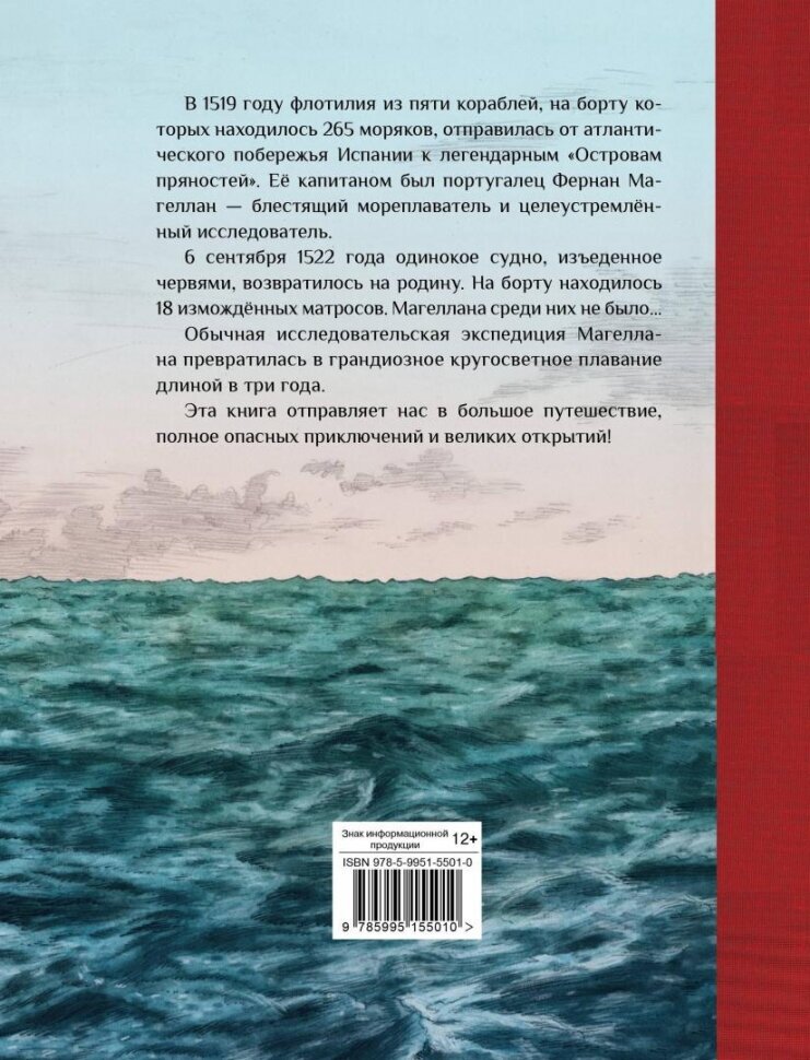 В 1519 году флотилия из пяти кораблей, на борту которых находилось 265 моряков, отправилась от атлантического побережья Испании к легендарным «Островам пряностей». Её капитаном был португалец Фернан Магеллан — блестящий мореплаватель и целеустремлённый исследователь. 6 сентября 1522 года одинокое судно, изъеденное червями, возвратилось на родину. На борту находилось 18 измождённых матросов. Магеллана среди них не было... Обычная исследовательская экспедиция Магеллана превратилась в грандиозное кругосветное плавание длиной в три года. Эта книга отправляет нас в большое путешествие, полное опасных приключений и великих открытий!
