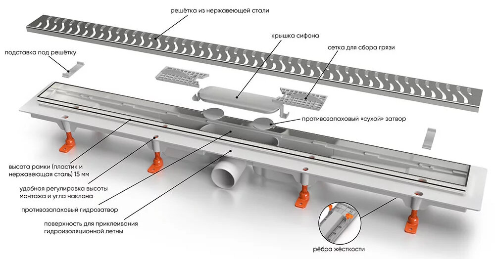| ВКоробке | Душевой желоб - 1 шт. Решетка - 1 шт. Сифон - 1 шт. Комплект опор - 1 шт. Прокладка гидроизолирующая - 1 шт. Инструкция - 1 шт. |