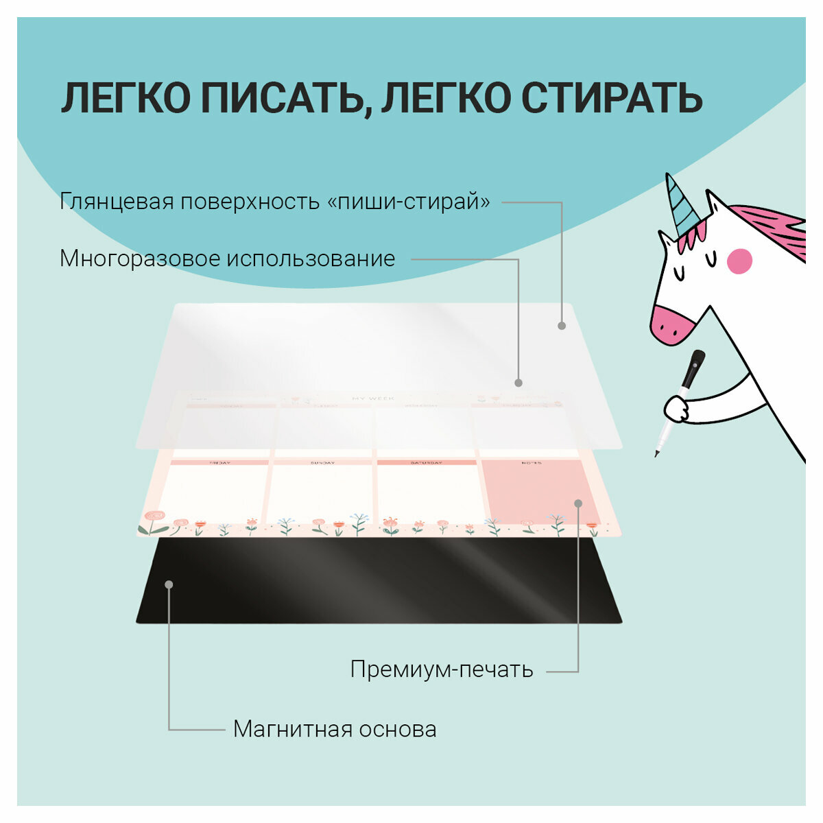 Внимание! Используйте только маркер на водной основе. Для очистки поверхности используйте влажную салфетку. Планер выполнен в оригинальном цветочном дизайне. Он поможет запомнить задачи, спланировать расписание и встречи с коллегами, друзьями или семьёй.